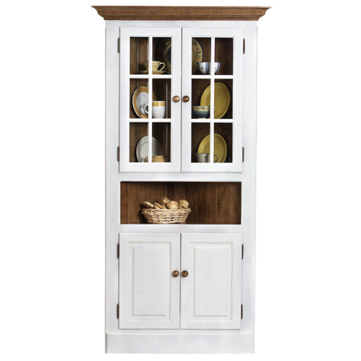 Mobile ad angolo in stile provenzale, realizzato in legno massello bianco semi-opaco, ideale per ambienti che richiedono eleganza e praticità. Lo stile rustico chic si integra perfettamente in arredamenti classici o contemporanei. Dotato di 2 sportelli in legno e vetro nella parte superiore e 2 sportelli in legno nella parte inferiore, offre ampio spazio per riporre oggetti mantenendo un’estetica raffinata.