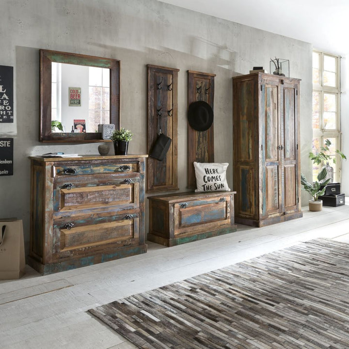 NOTE: Legno riciclato verniciato, 3 ripiani (1 fisso), appendiabiti, peso 67 kg, già montato, prodotto artigianale.
