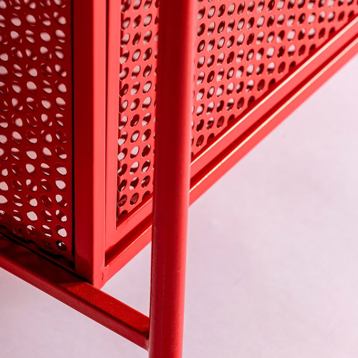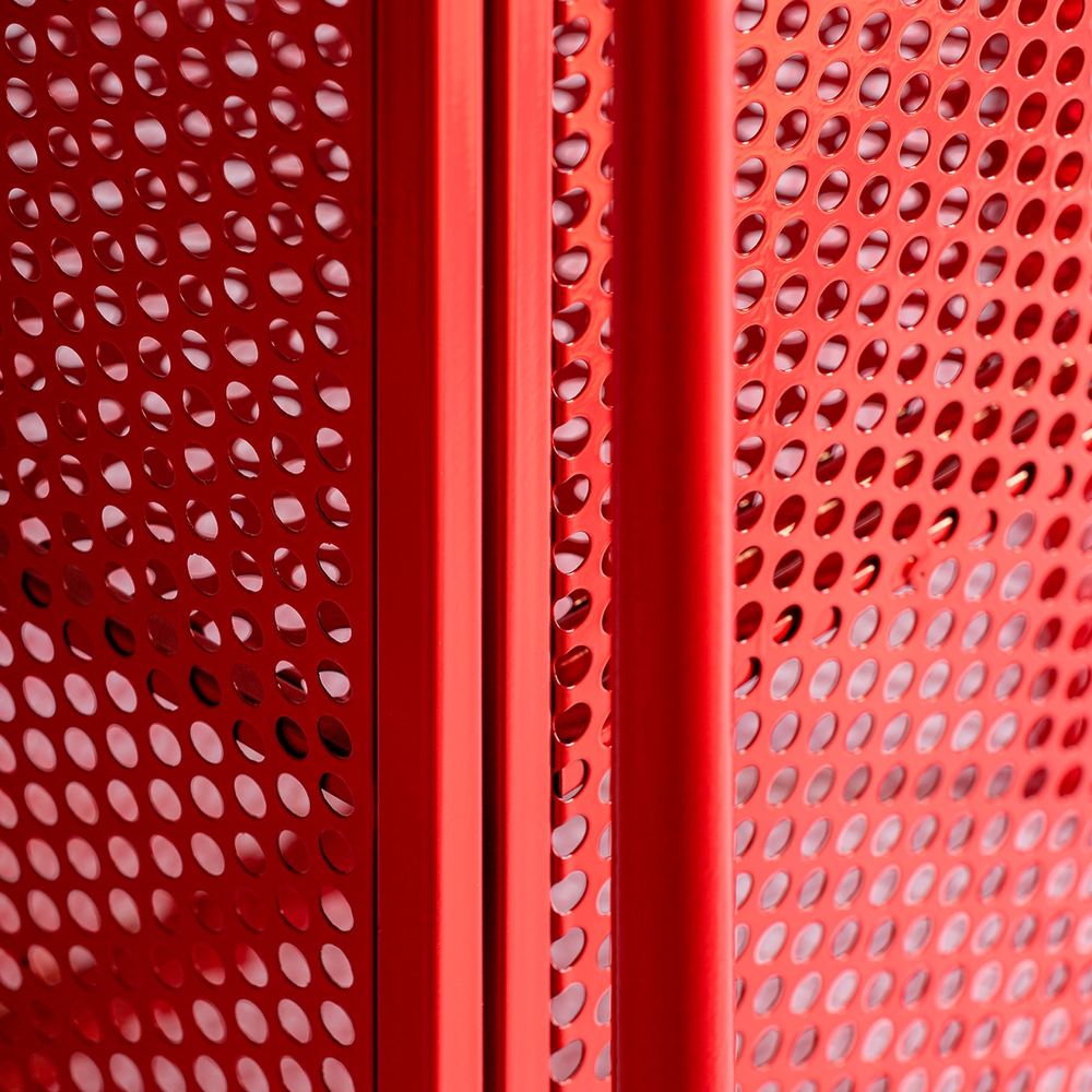 NOTE: Ferro laccato rosso, struttura griglia, ripiani interni, peso 22 kg, prodotto artigianale.