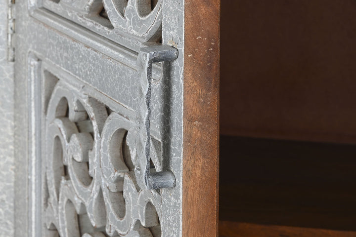 Scopri l'armadio orientale grigio shabby, un'elegante combinazione di design orientale e stile shabby chic. Realizzato in legno massiccio con raffinati inserti in specchio, questo mobile cattura la luce, creando suggestivi giochi di luci e ombre. Con le sue dimensioni di 103 cm di larghezza, 45 cm di profondità e 180 cm di altezza, è ideale per aggiungere un tocco di classe a qualsiasi ambiente. Dotato di due porte e ripiani interni, offre ampio spazio di stoccaggio. Perfetto per chi cerca mobili orientali originali online, questo armadio unisce forma e funzionalità, portando una bellezza senza tempo nella tua casa.