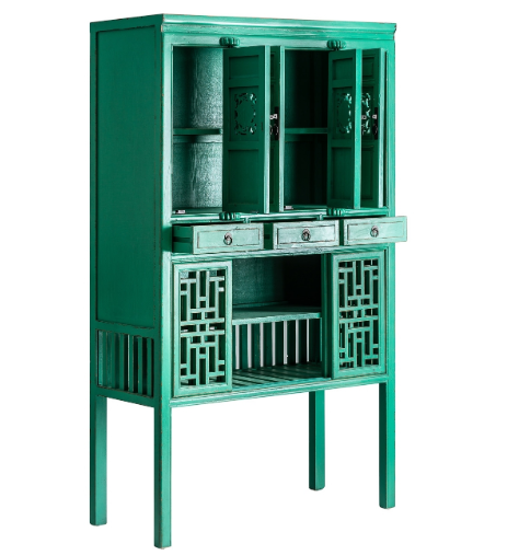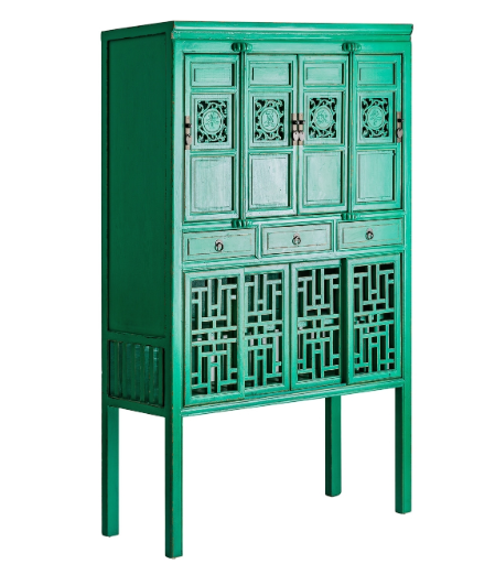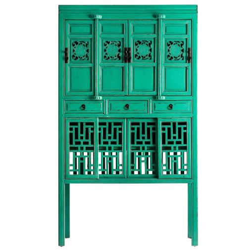 L'Armadio Orientale Turchese è realizzato in legno massello di olmo anticato, con un effetto shabby che conferisce un fascino unico. Con dimensioni di 110 x 50 x H 190 cm, è dotato di 4 ante, di cui 2 scorrevoli, e 3 cassetti, offrendo ampio spazio di archiviazione. Le maniglie in metallo aggiungono un tocco di eleganza al design. Questo armadio, realizzato e intarsiato artigianalmente, è perfetto per chi cerca armadi etnici indiani, portando un tocco di cultura e stile nella propria casa.