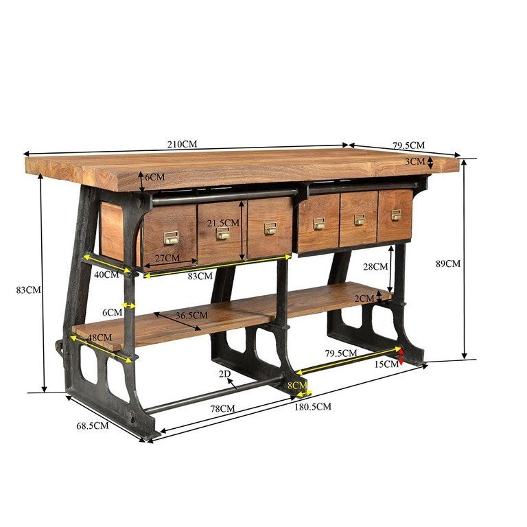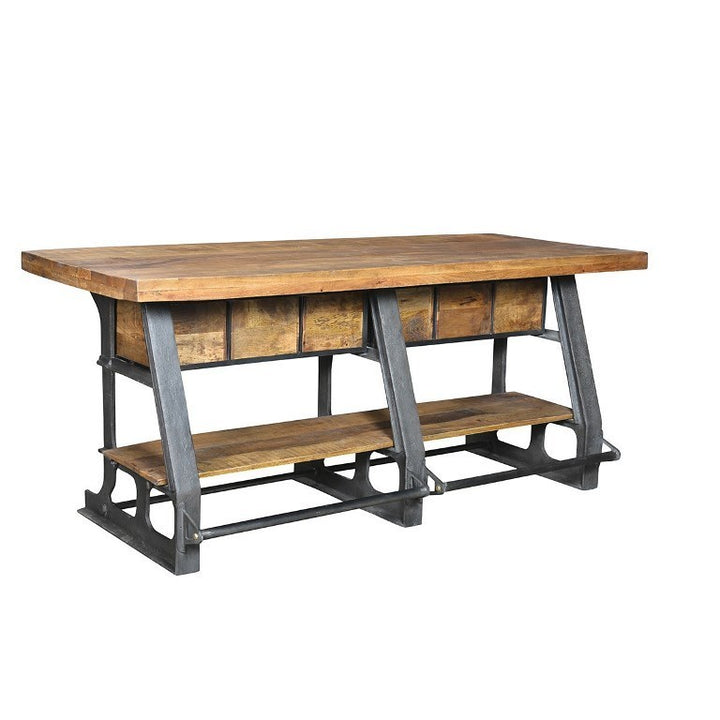 Design Industriale Autentico: Questo bancone è realizzato con legno di mango massiccio e una struttura in ferro battuto, catturando l'essenza dell'estetica industriale.