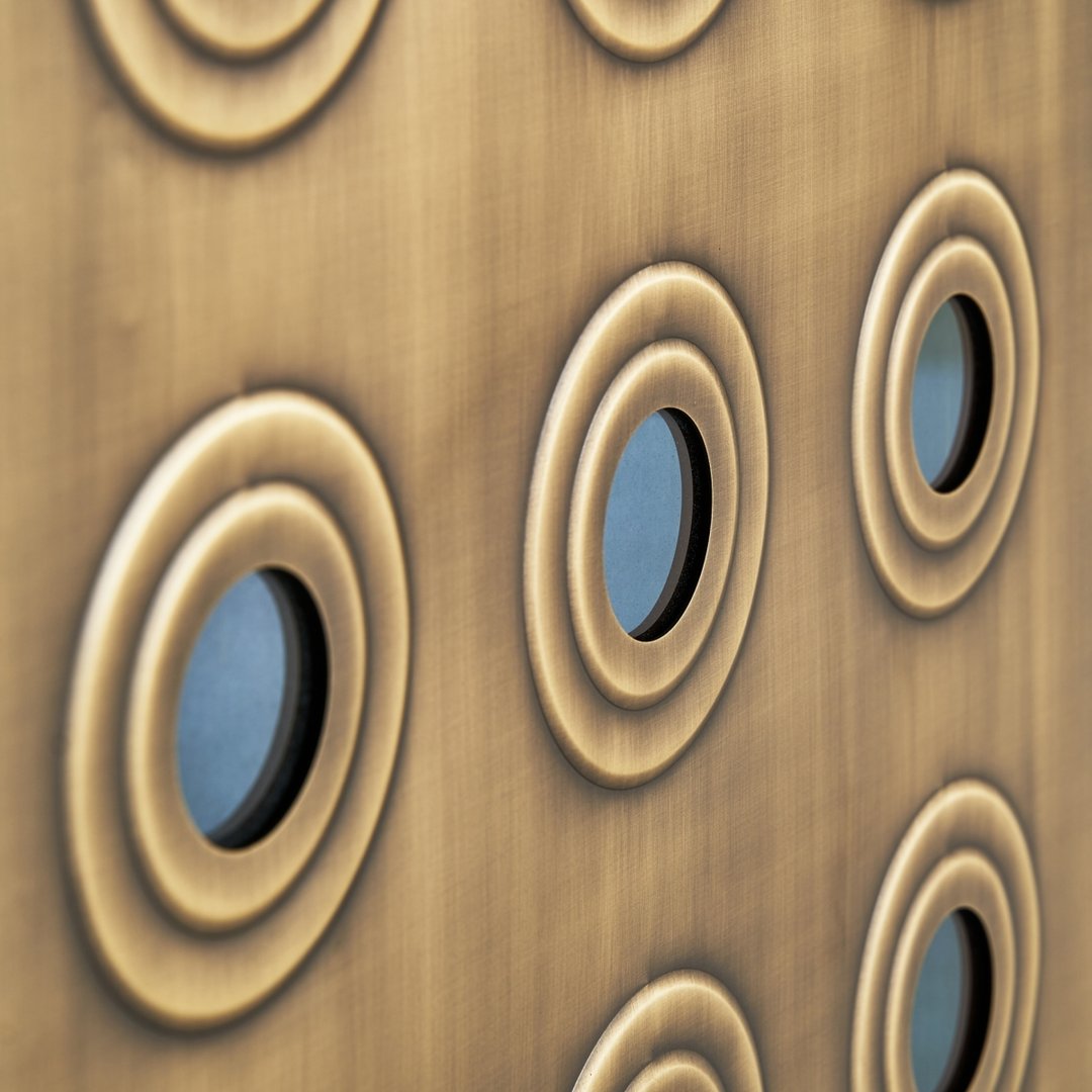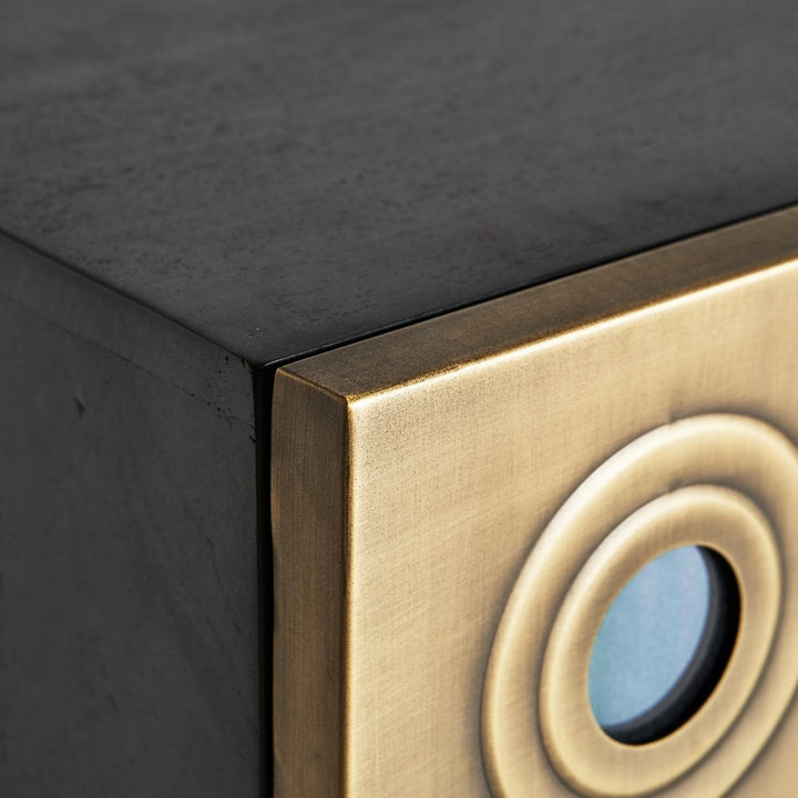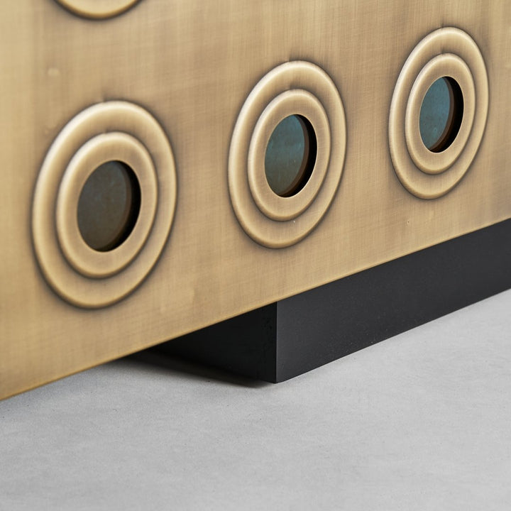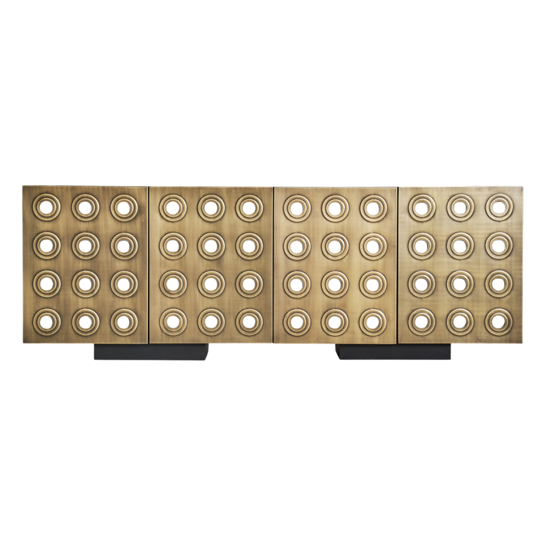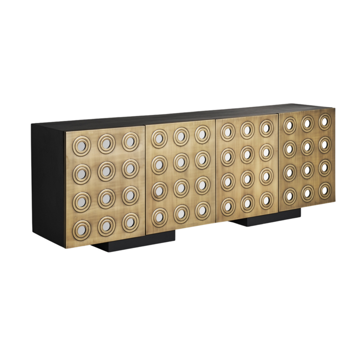 Lo stile Art Deco moderno si caratterizza per l'uso di motivi geometrici audaci, finiture metalliche lussuose e un'estetica che combina eleganza e opulenza. Questo buffet, con le sue superfici dorate e rilievi circolari, conferiscono al mobile un aspetto ricco e decorativo, tipico dello stile Art Deco moderno. Il design è pulito e simmetrico, con un forte senso di ordine e glamour. I materiali utilizzati, come il metallo dorato, insieme alle forme geometriche, aggiungono un tocco di lusso e sofisticazione, rendendo il mobile un pezzo distintivo e accattivante. Realizzato in robusto ferro e legno di mango, dimensioni di 208 x 46 x 74 cm e un peso di 79,8 kg, questo buffet offre quattro porte con vani interni di 98 x 41 x 62 cm. Ogni vano contiene un ripiano fisso con un'altezza di 30 cm e una capacità di carico di 15 kg. Le gambe, di dimensioni 47 x 38 x 8 cm, sono dotate di tacchi regolabili per una maggiore stabilità. Un mobile perfetto per aggiungere funzionalità ed eleganza al tuo spazio.