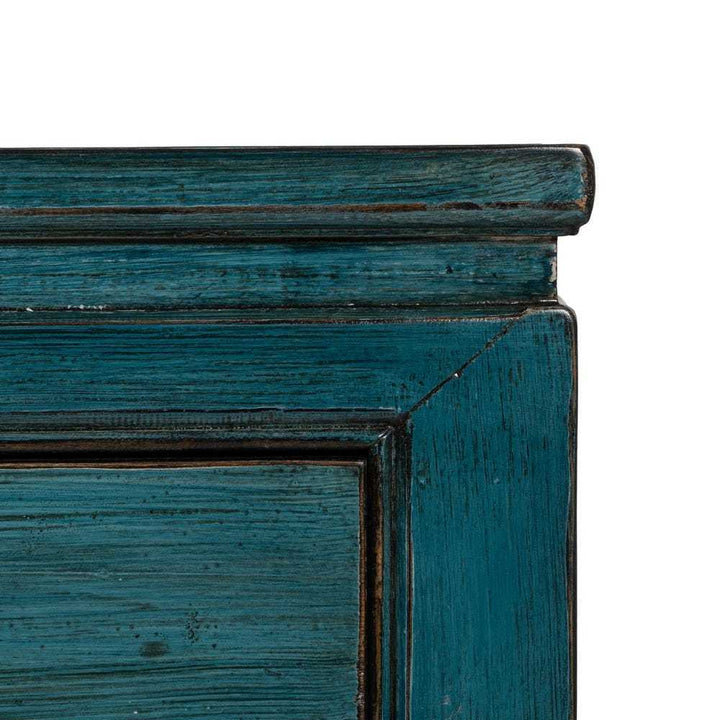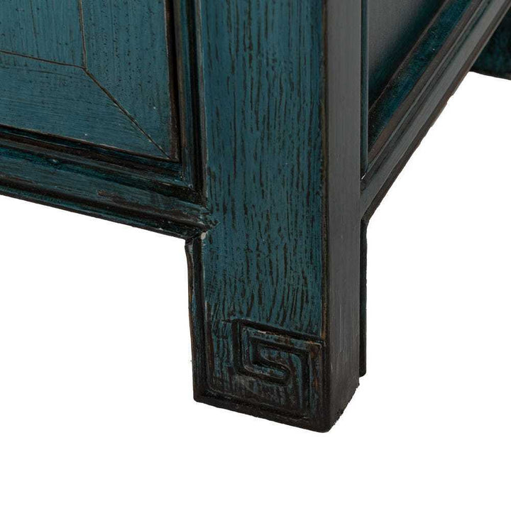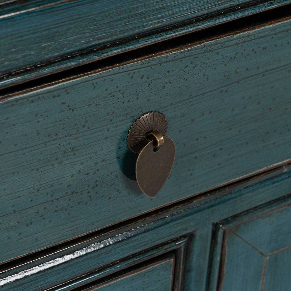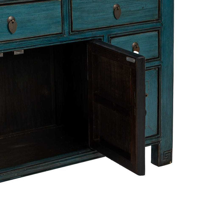 Un mobile dallo stile orientale in una tonalità accattivante di blu con finiture anticata, il che gli conferisce un aspetto vissuto e caratteristico. Si può notare un sottile gioco di ombre che evidenzia la texture del legno e i dettagli dei pomelli e delle serrature in rame, elementi che risaltano contro il colore vivace del buffet. La composizione è semplice, con il buffet posizionato al centro su uno sfondo neutro, permettendo al prodotto di essere il protagonista indiscusso dell'immagine.Un pezzo maestro di arredo di design, il Buffet cinese orientale blu rappresenta una scelta raffinata per chi cerca un connubio tra tradizione e modernità. L'artigianato di qualità e lo stile intramontabile si coniugano nella solida struttura in legno massello di pino riciclato, espressione di sostenibilità e durevolezza. Le tonalità di blu vivide ma elegantemente consumate donano a ogni ambiente un tocco di carisma senza tempo, adattandosi perfettamente sia a interni classici che a quelli più contemporanei. I dettagli in rame dei manici aggiungono un ulteriore livello di finezza. Pratico per la conservazione grazie alle sue ampie dimensioni di 140 x 40 x H 85 cm, questo buffet cinese è dotato di diverse ante e cassetti per un'organizzazione ottimale degli spazi. Il suo stile esclusivo e la funzionalità lo rendono ideale per chi desidera un mobile dal forte impatto estetico e dalla grande capacità.