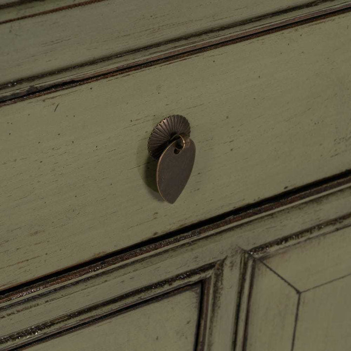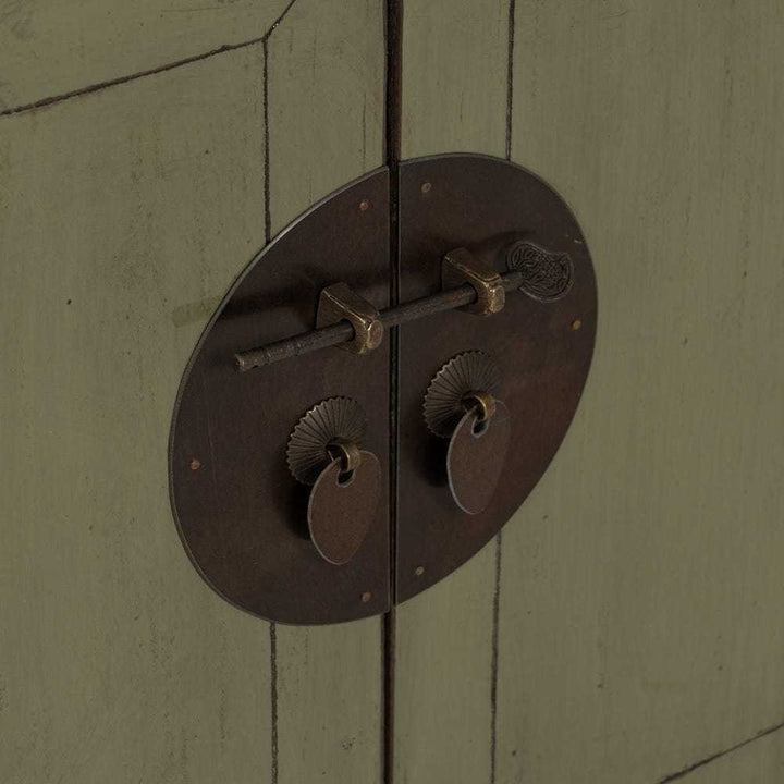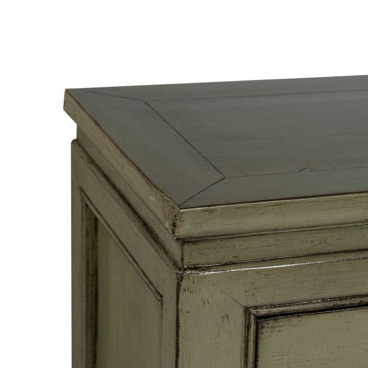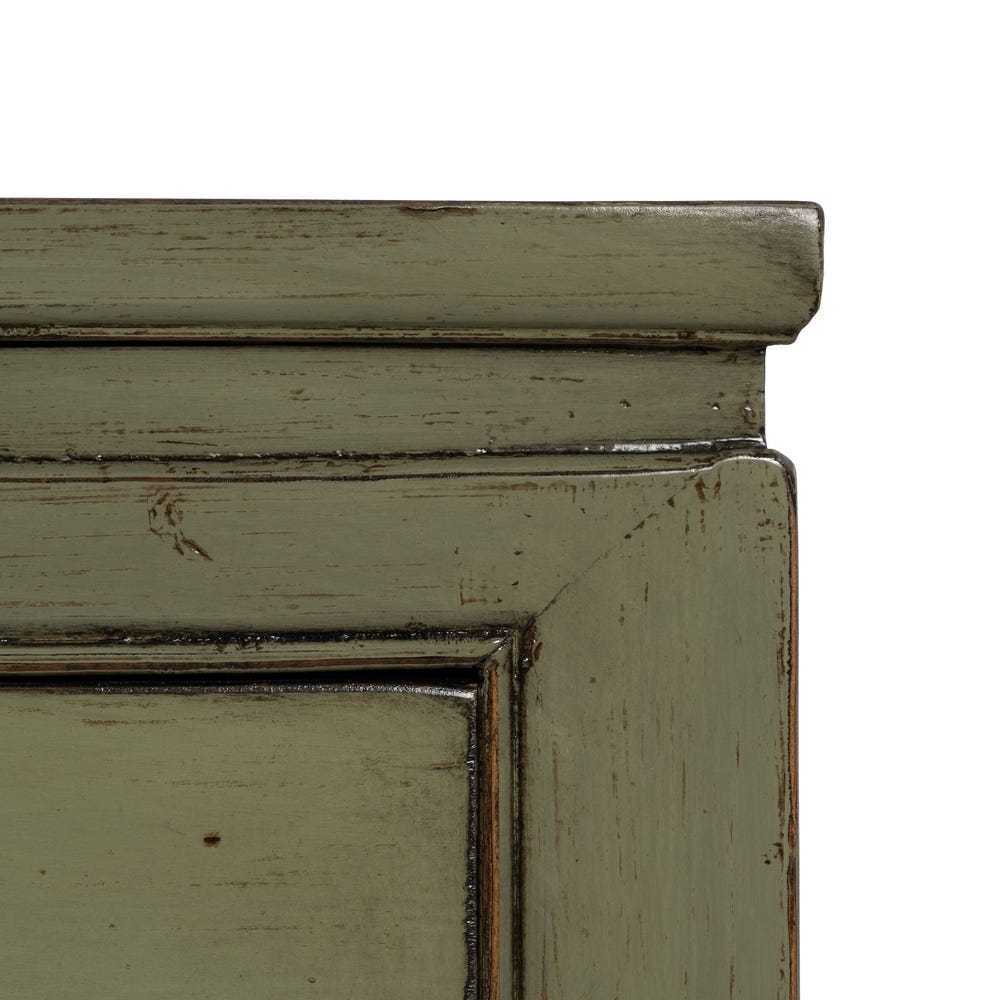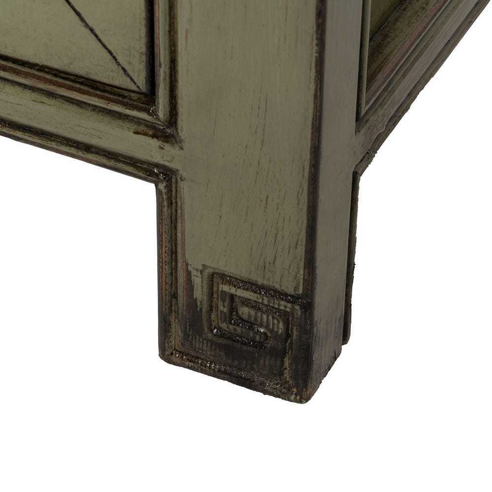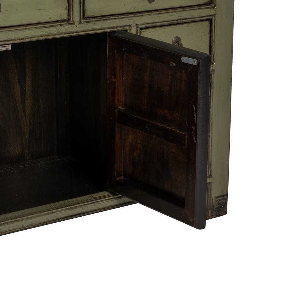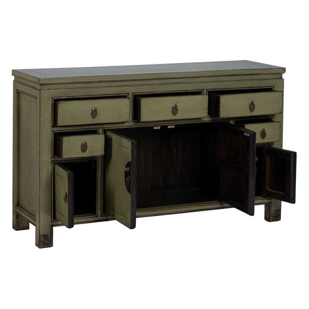 L'elegante espressione dello stile orientale cinese, arricchito da un tocco contemporaneo. Il colore verde oliva, sottile e sofisticato, insieme alla patina leggermente invecchiata, conferisce al pezzo un aspetto vissuto e accogliente. I dettagli accurati, come i manici in rame, sottolineano la cura artigianale, mentre la struttura e le linee del mobile richiamano la tradizione del design orientale.elegante espressione dello stile orientale cinese, arricchito da un tocco contemporaneo. Il colore verde oliva, sottile e sofisticato, insieme alla patina leggermente invecchiata, conferisce al pezzo un aspetto vissuto e accogliente. I dettagli accurati, come i manici in rame, sottolineano la cura artigianale, mentre la struttura e le linee del mobile richiamano la tradizione del design orientale. Scopri l'eleganza discreta del nostro Buffet cinese orientale verde oliva, un mobile che fonde l'antica saggezza del design orientale con un'estetica moderna. Realizzato in legno massello di pino riciclato, questo buffet è non solo bello ma anche eco-sostenibile. Le dimensioni di 140 cm di larghezza, 40 cm di profondità e 85 cm di altezza lo rendono perfetto per arricchire il tuo spazio con funzionalità e stile. Caratterizzato da ampie ante di misure 35x42,5 cm e una porta più piccola di 22x27,5 cm, offre una varietà di opzioni di stoccaggio. I 3 cassetti grandi di 38,5x12 cm e 2 cassetti piccoli di 22,5x11 cm sono ideali per organizzare oggetti più piccoli. Con gambe solide alte 10 cm e una capacità di carico di 100 kg, questo buffet è progettato per durare nel tempo. La sua presenza è una dichiarazione di gusto che unisce praticità a una bellezza senza tempo.