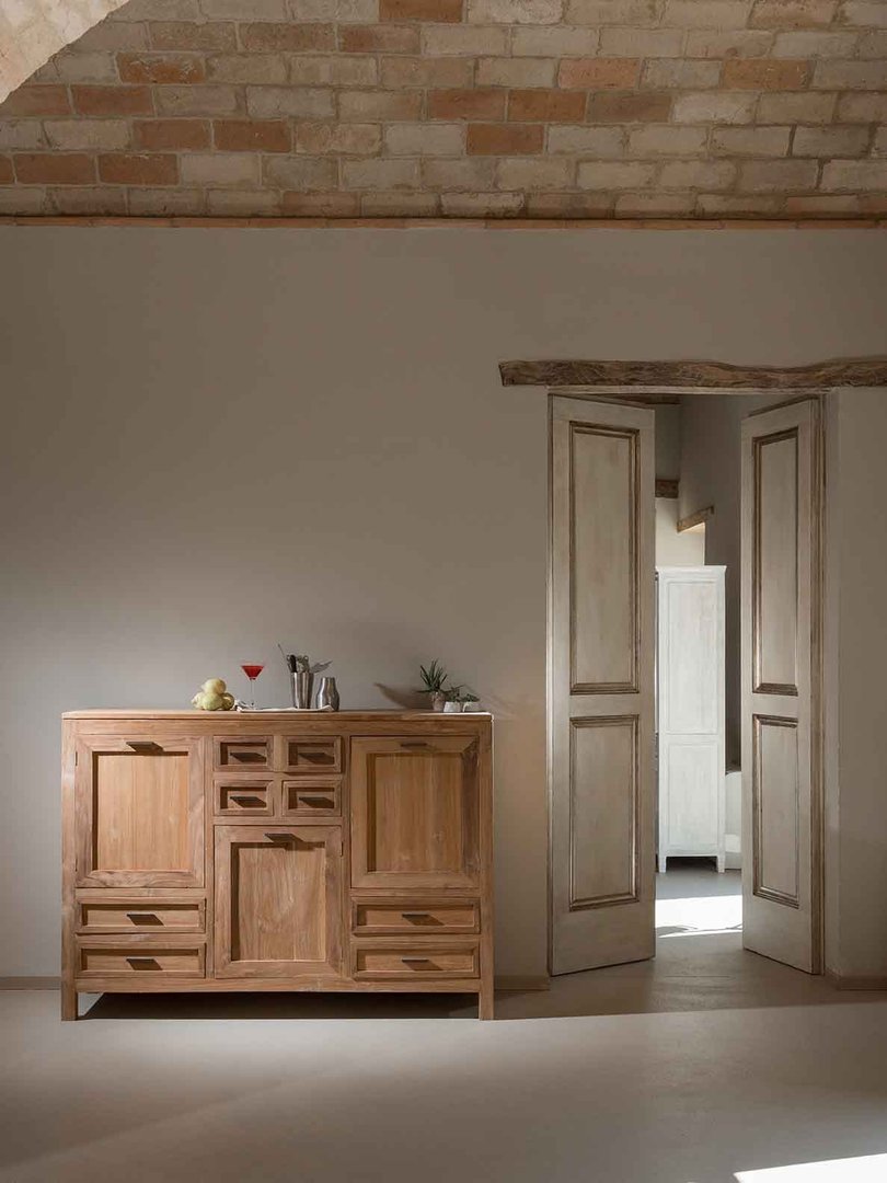 Lo stile country chic si contraddistingue per il suo fascino rustico e accogliente, unendo eleganza e semplicità per creare ambienti caldi e invitanti. Questo stile spesso incorpora materiali naturali come il legno massello, valorizzando le texture e i colori della natura. Il buffet in teak naturale rappresenta perfettamente queste caratteristiche, con le sue dimensioni di L 155 x P 45 x H 110 cm, fornendo ampio spazio di stoccaggio attraverso 3 ante e 8 cassetti. La finitura a cera sottolinea le venature e il colore dorato del teak, rendendolo un pezzo centrale in ogni ambiente country chic. Disponibile anche nella versione bianco decapé, il buffet offre una scelta ideale per chi cerca un tocco più luminoso e fresco, perfetto per interni shabby chic, mantenendo l'autenticità di uno spazio rustico o classico. Questo mobile non solo arricchisce la decorazione, ma migliora anche l'organizzazione domestica.