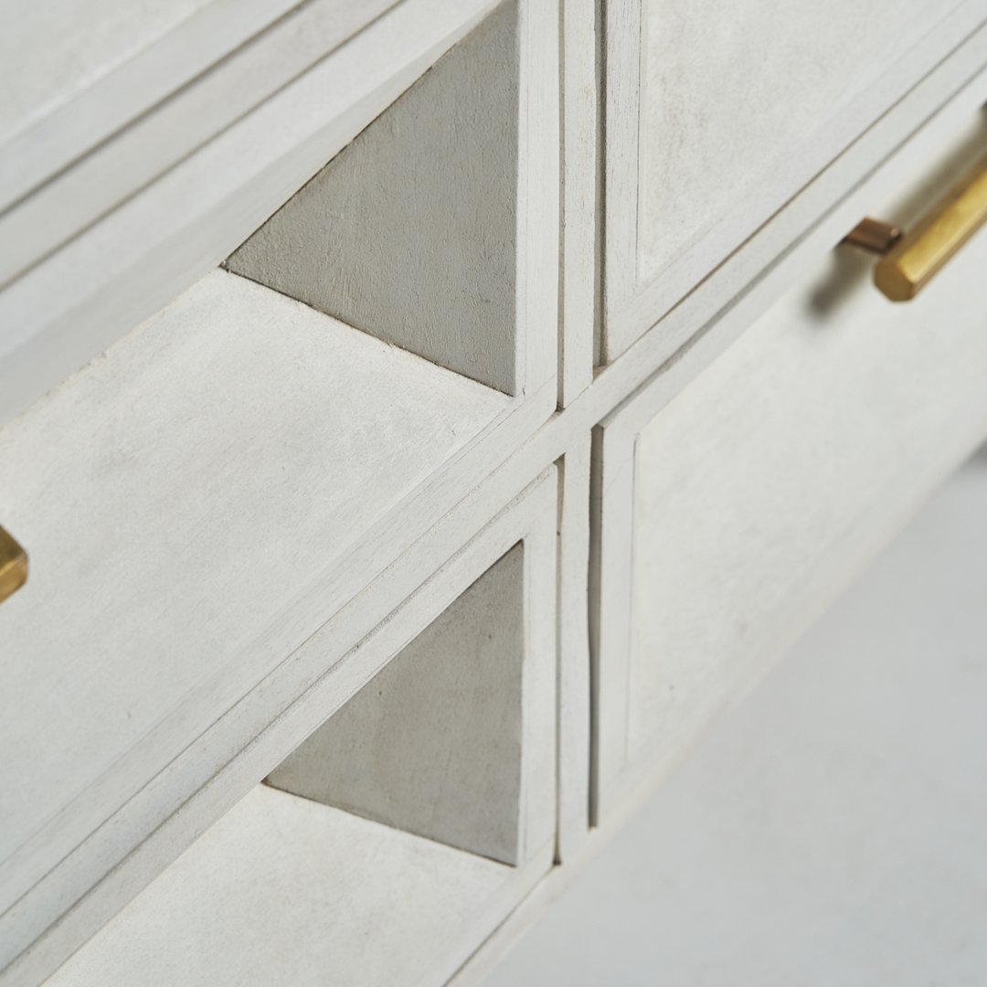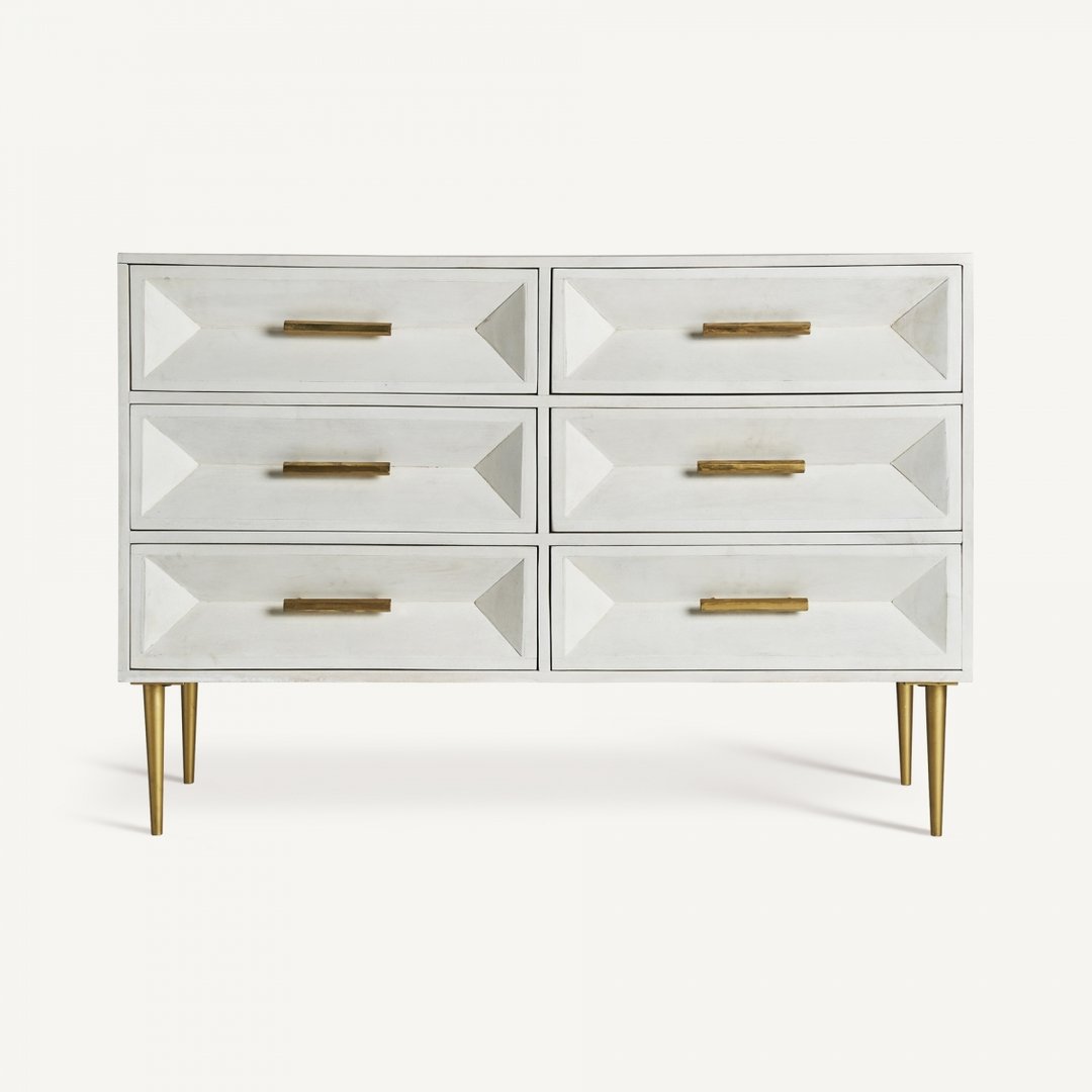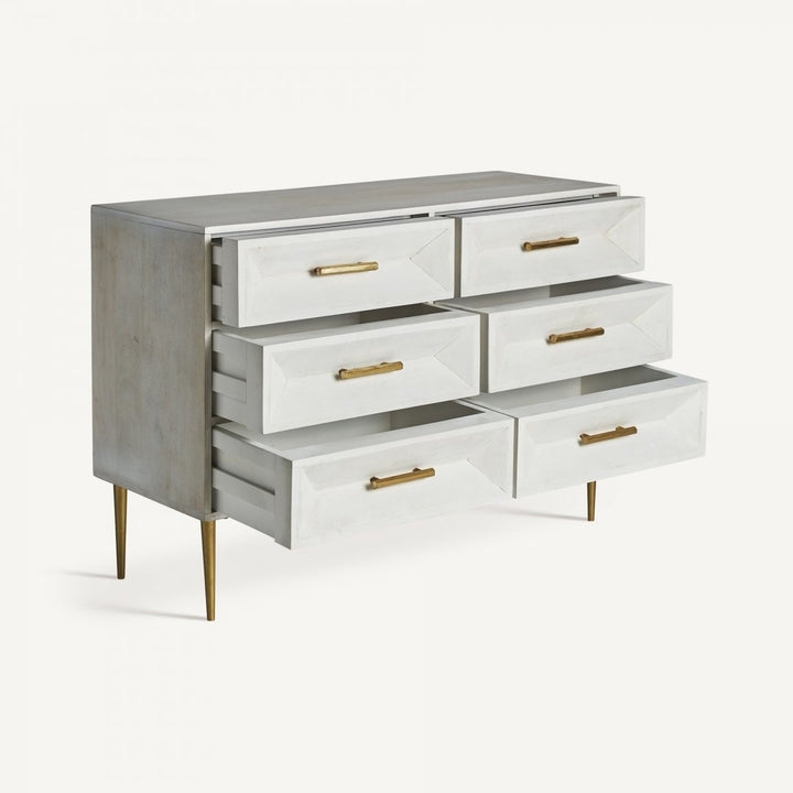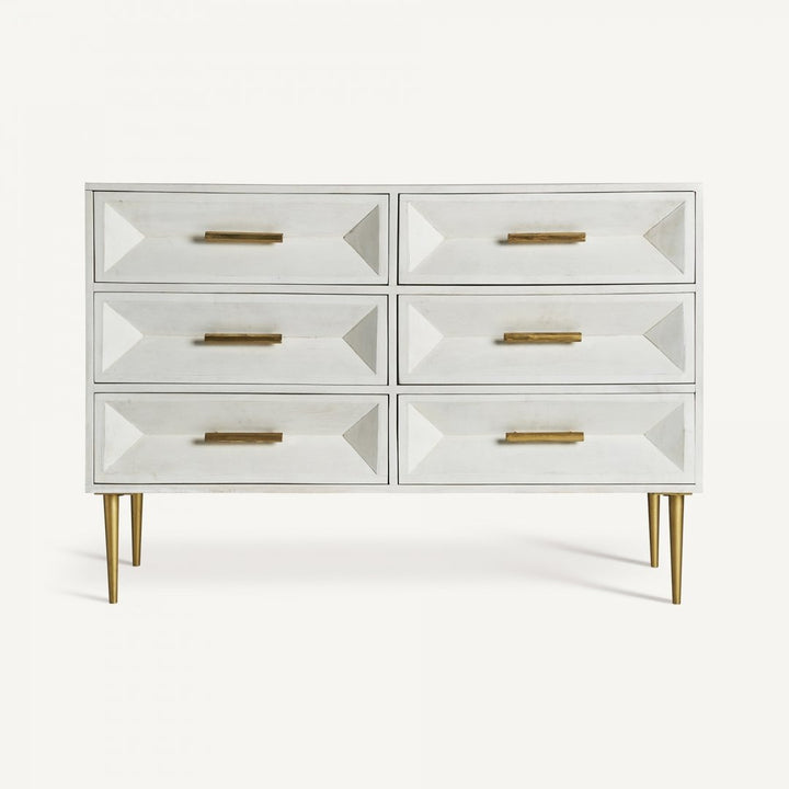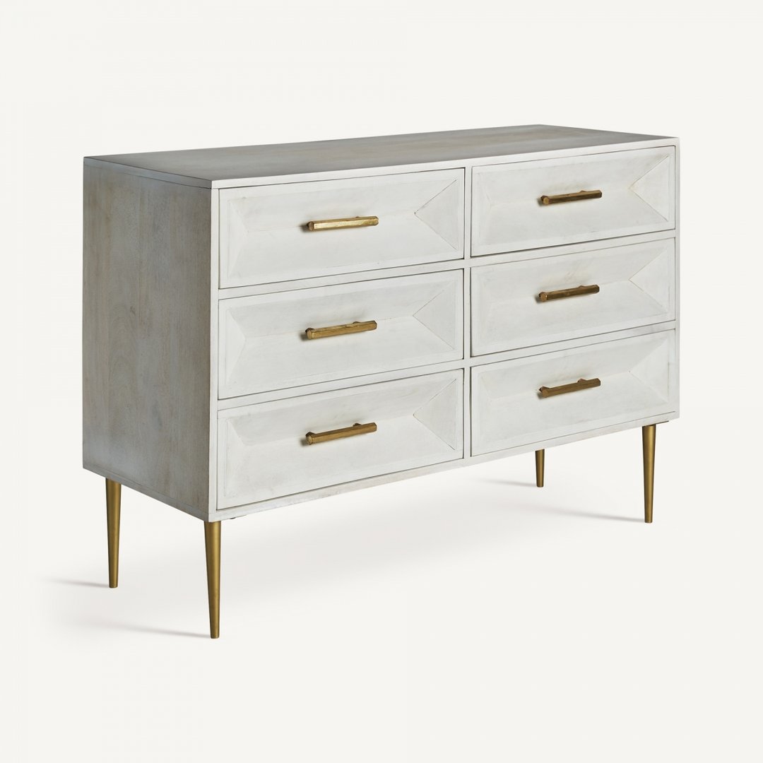 Questo elegante buffet decò chic provenzale è realizzato in robusto legno di mango con una finitura color crema e dettagli in oro antico. Il mobile, composto da 6 cassetti con maniglie e gambe in metallo, unisce stile shabby chic a funzionalità, perfetto per chi cerca credenze shabby chic online. Artigianale e pezzo unico, offre un ampio spazio di archiviazione, rendendolo un elemento centrale e raffinato per il soggiorno. Misure interne cassetti: 53x27x14 cm. Gambe: 2x2x22 cm, smontabili. Peso totale: 70 kg, con una capacità di supporto di 40 kg. Include ancoraggio a parete per una maggiore stabilità. Questo buffet è ideale per aggiungere un tocco di eleganza e autenticità alla tua casa.