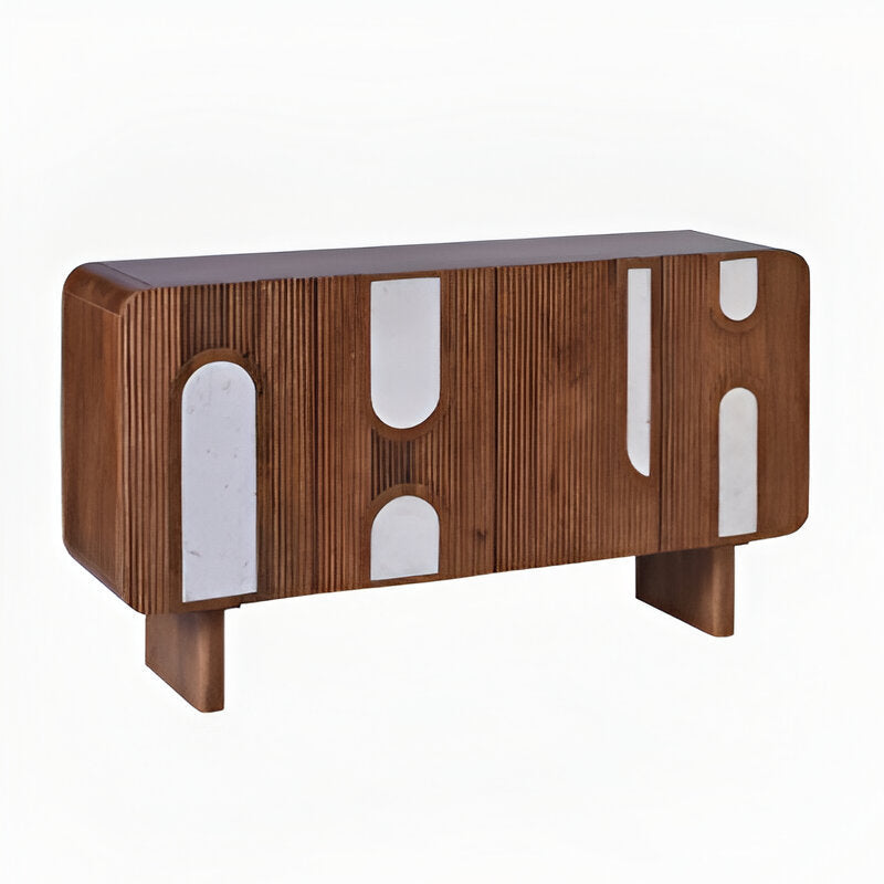 Lo stile etnico chic si distingue per la sua capacità di mescolare materiali naturali con un design che richiama culture e tradizioni di diverse parti del mondo. Questo stile è ideale per chi cerca un arredamento che aggiunga un tocco esotico e caldo agli spazi, utilizzando materiali come il legno massello e la pietra naturale. Questo buffet, realizzato in legno di mango combinato con travertino e legno MDF, è un pezzo artigianale con dettagli raffinati come le ante intarsiate. Con il suo colore marrone e bianco, si adatta perfettamente a un arredamento contemporaneo. Il mobile dispone di 4 ante che racchiudono due ampi vani con mensole fisse. Ogni vano ha dimensioni interne di 68 x 32 x 56 cm e uno spazio tra le mensole di 2 cm, con una capacità di carico per mensola di 10 kg. Il peso complessivo del buffet è di 53,6 kg, garantendo una struttura stabile e robusta. Le gambe, misurando 5 x 36 x 21 cm, conferiscono elevazione e leggerezza visiva al mobile, con una distanza tra di esse di 104 cm. Perfetto per chi cerca un buffet etnico online che unisca funzionalità e stile, questo pezzo arricchisce qualsiasi spazio abitativo con un tocco di eleganza esotica.