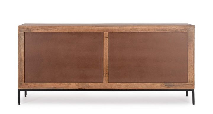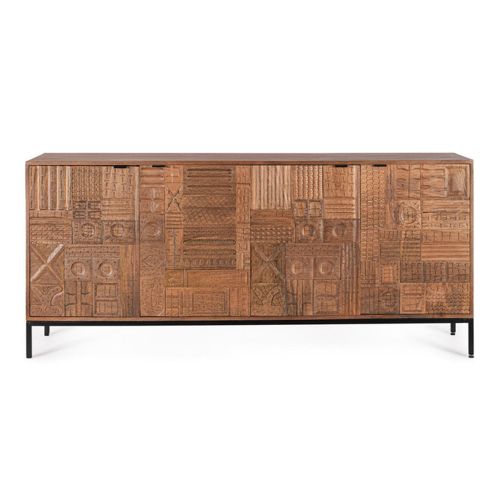 Questo buffet etnico artigianale è realizzato in legno massiccio di mango con un ampio frontale composto da 4 ante intarsiate a mano, rendendolo un pezzo unico e di grande fascino. La struttura è completata da un solido schienale in MDF, mentre la verniciatura a base di nitrocellulosa mette in risalto la bellezza naturale del legno. Le gambe e le maniglie in acciaio aggiungono un tocco moderno e contemporaneo. Ogni vano porta è dotato di mensola interna, offrendo spazio aggiuntivo per l'organizzazione e lo stoccaggio.