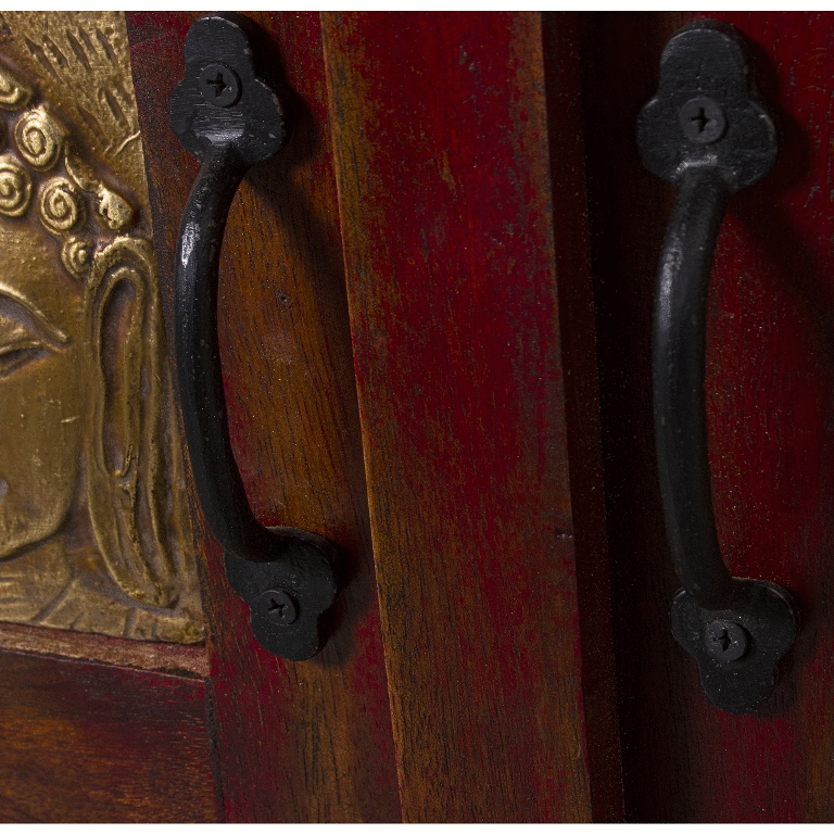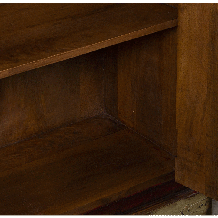 Materiale di Qualità Superiore: Questo Buffet Credenza è realizzato con legno massello di mango, conferendo al mobile una struttura robusta e una sensazione di autenticità. Le applicazioni in ottone anticato dorato donano un tocco di eleganza e un fascino retrò che si adatta perfettamente a molteplici stili di arredamento.