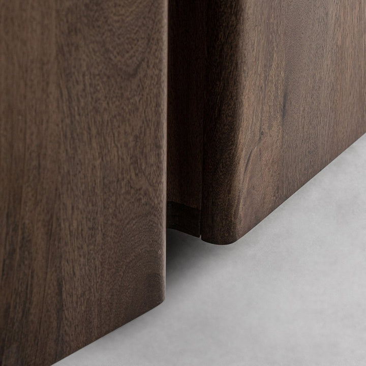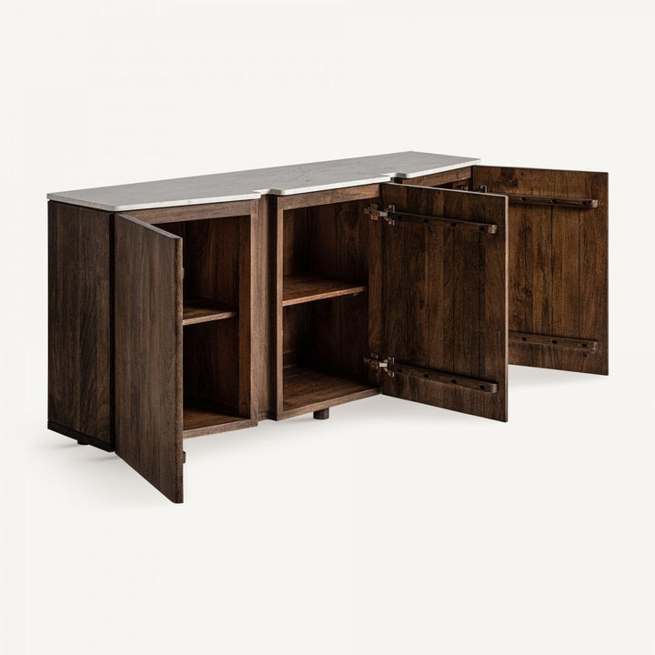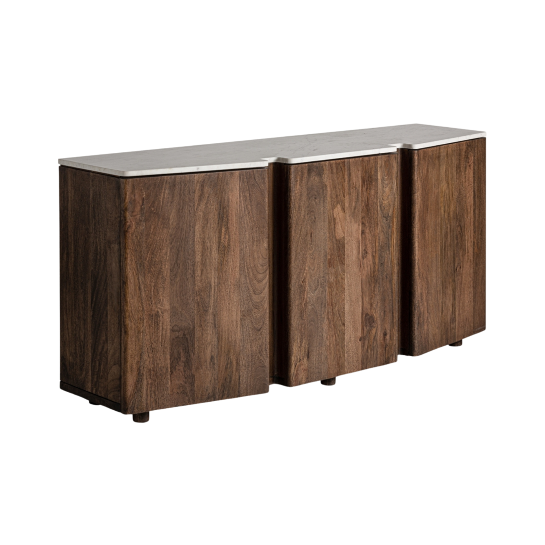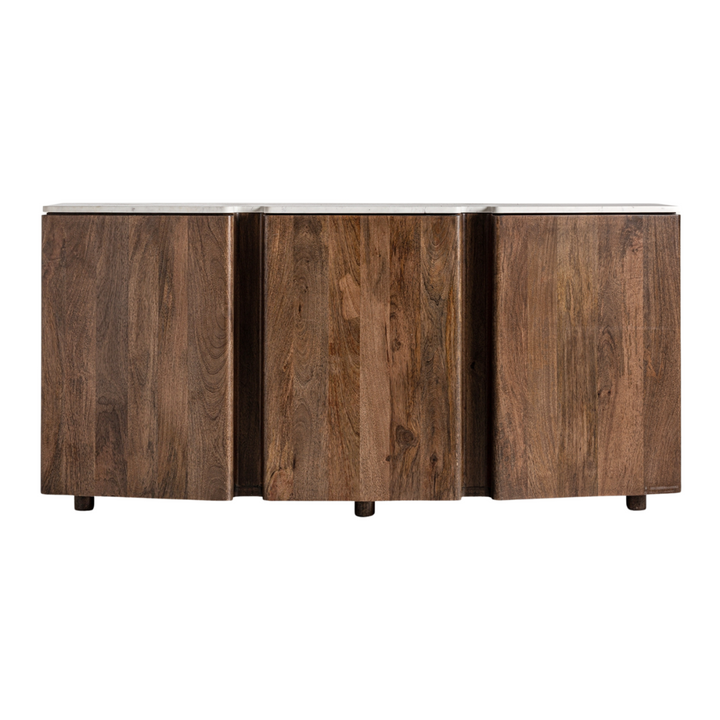 Lo stile minimal chic combina semplicità ed eleganza con una forte attenzione ai dettagli e ai materiali di alta qualità. Questo stile si distingue per le linee pulite e l'aspetto sobrio, che creano un'estetica moderna e raffinata. La scelta del legno massello conferisce un senso di calore e naturalezza, mentre le superfici lisce e i bordi arrotondati aggiungono un tocco di modernità. Evidenziando la solidità e la bellezza del legno di mango, questo buffet è una testimonianza di artigianato e design. Le sue massicce ante in una tonalità marrone intenso offrono una dichiarazione di robustezza, mentre l'aggiunta del marmo aggiunge un tocco sofisticato.Con dimensioni di 160 x 45 x 75 cm e un peso di 98,4 kg, questo mobile fatto a mano offre tre porte e un ripiano regolabile. Le gambe di 5x5x5 cm con tacchi regolabili garantiscono stabilità. Ideale per soggiorni e sale da pranzo, il suo design minimalista chic permette di inserirsi armoniosamente in diversi contesti. Include ancoraggio a parete per maggiore sicurezza.