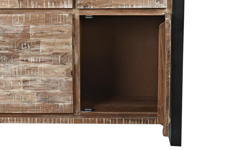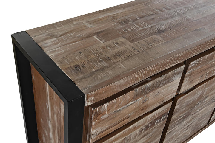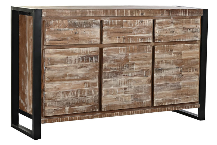Questo buffet presenta uno stile industrial, dove la robustezza del legno massello di acacia incontra la forza espressiva del metallo. L'abbinamento crea un contrasto visivo che esalta sia la calda texture del legno sia la freddezza industriale del metallo, perfetto per chi ama un look urbano e contemporaneo. Eleva l'estetica del tuo ambiente con il nostro Buffet Industrial in Legno di Acacia. Progettato per gli amanti dello stile contemporaneo, questo mobile combina la naturale resistenza del legno massello di acacia con l'eleganza funzionale del metallo, offrendo una soluzione di arredo di carattere. Con dimensioni complessive di 140 cm x 40 cm x H 85 cm e un peso di 61 kg, questo buffet dispone di tre cassetti e tre porte, offrendo abbondante spazio organizzativo. Ogni cassetto ha una larghezza di 35 cm, una profondità di 35 cm e un'altezza di 12 cm, perfetto per riporre oggetti personali e accessori domestici. Le porte, ognuna di 40 cm di larghezza, 2 cm di fondo e 45 cm di altezza, celano ripiani aggiuntivi per massimizzare la funzionalità dello spazio. Scegli tra la nostra selezione di buffet industrial online e porta a casa un mobile che è tanto un'opera d'arte quanto un fedele compagno di organizzazione.
