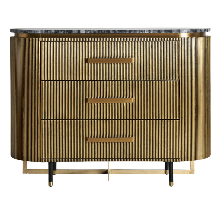 Realizzata in ferro con dettagli in marmo, la cassettiera trasuda lusso grazie alla sua finitura dorata. Il design combina estetica e funzionalità, rendendola perfetta sia per la camera da letto che per il soggiorno. Dotata di tre ampi cassetti (74x37x19 cm), offre spazio sufficiente per organizzare vari oggetti mantenendo ordine e stile. La struttura solida in ferro, unita al marmo nero venato, aggiunge un tocco di eleganza e distinzione a qualsiasi ambiente.