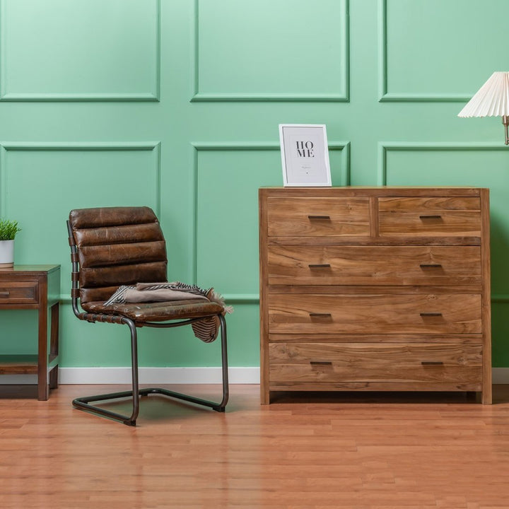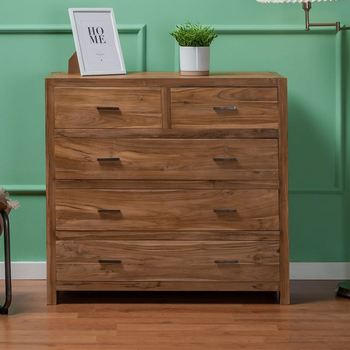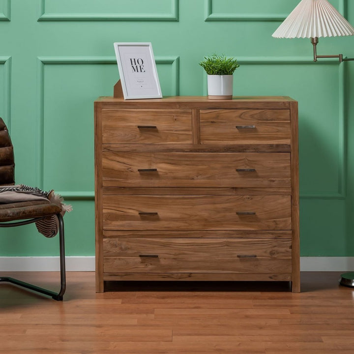 Meravigliosa l'eleganza rustica della Cassettiera Country Chic, meticolosamente realizzata in legno massello di teak naturale. Questo pezzo d'arredamento, essenziale per la zona notte, si distingue per il suo stile raffinato e la funzionalità pratica. La finitura a cera naturale protegge il legno e ne esalta le caratteristiche estetiche, dal colore dorato alle venature profonde, conferendo un aspetto caldo e accogliente. Dotata di 5 cassetti, ognuno con maniglie in ottone anticato, offre un'ampia capacità di stoccaggio. Le dimensioni sono 105 cm di larghezza, 46 cm di profondità e 98 cm di altezza, rendendola una scelta ideale per ogni ambiente domestico. Esplora la nostra selezione di cassettiere etniche online per scoprire pezzi unici che combinano funzionalità e stile, perfetti per interni in stile classico, rustico, etnico o shabby chic. Disponibile anche la versione in teak sbiancato con un supplemento del 20%