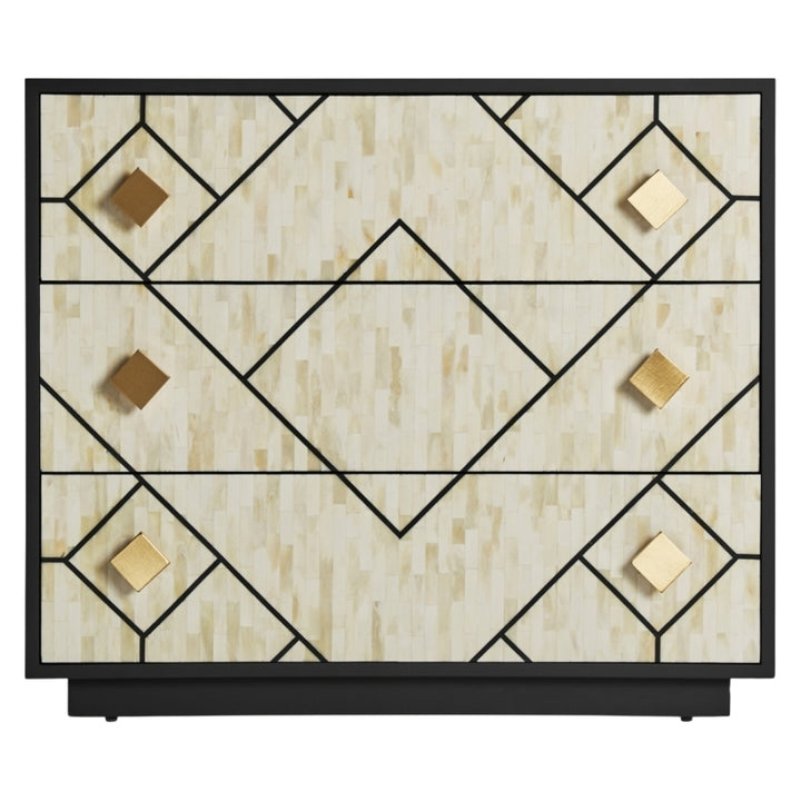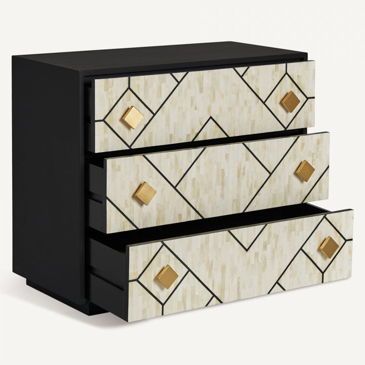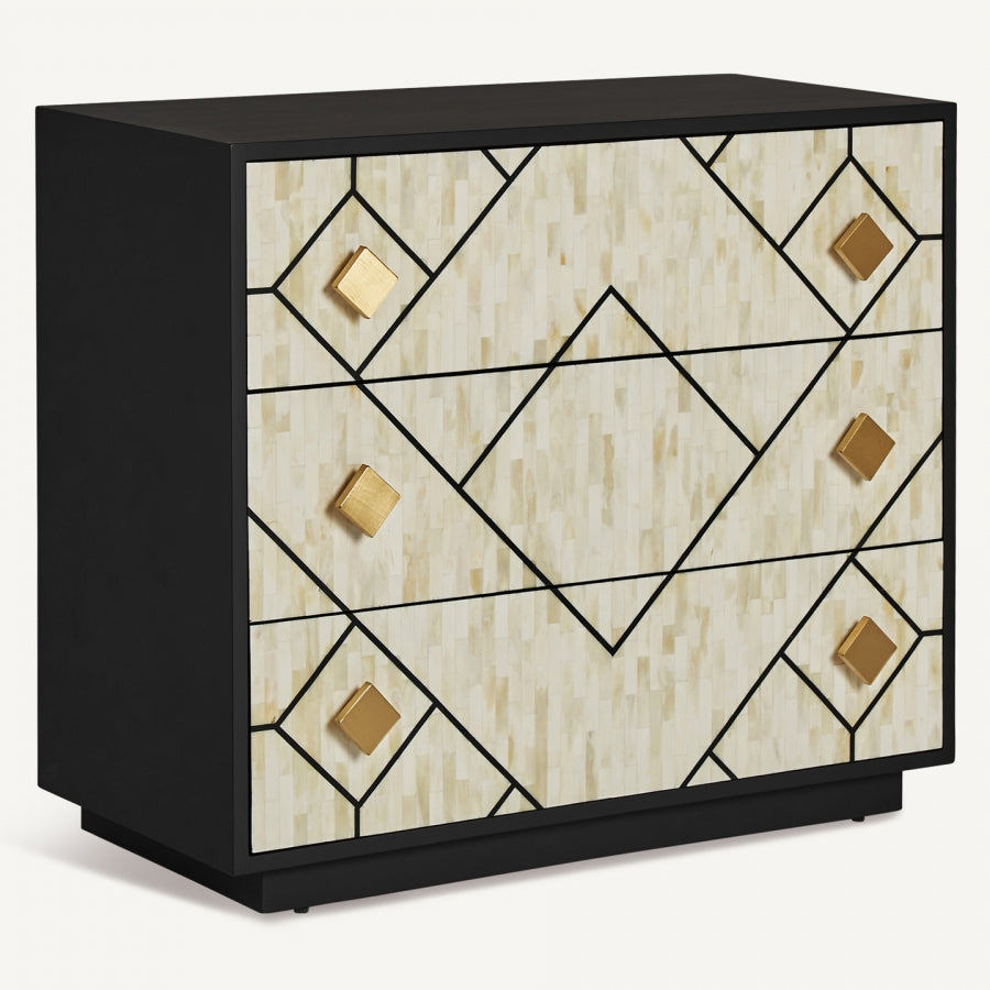 Lo stile art déco è sinonimo di lusso e raffinatezza, caratterizzato da linee geometriche, materiali pregiati e una combinazione di colori esclusiva. Questa cassettiera art déco, realizzata in mdf combinato con osso, si distingue per la sua colorazione nera, impreziosita da dettagli in bianco e oro. Ideale per arricchire ambienti con un tocco di eleganza, unisce estetica e funzionalità. Dotata di tre ampi cassetti (dimensioni interne 80x30x16 cm), offre spazio sufficiente per riporre oggetti mantenendo ordine e stile. La struttura solida e la lavorazione artigianale garantiscono una capacità di carico fino a 60 kg. Perfetta per chi desidera mobili art déco, questa cassettiera si adatta a soggiorni, camere da letto o ingressi, donando esclusività e charme ad ogni ambiente.