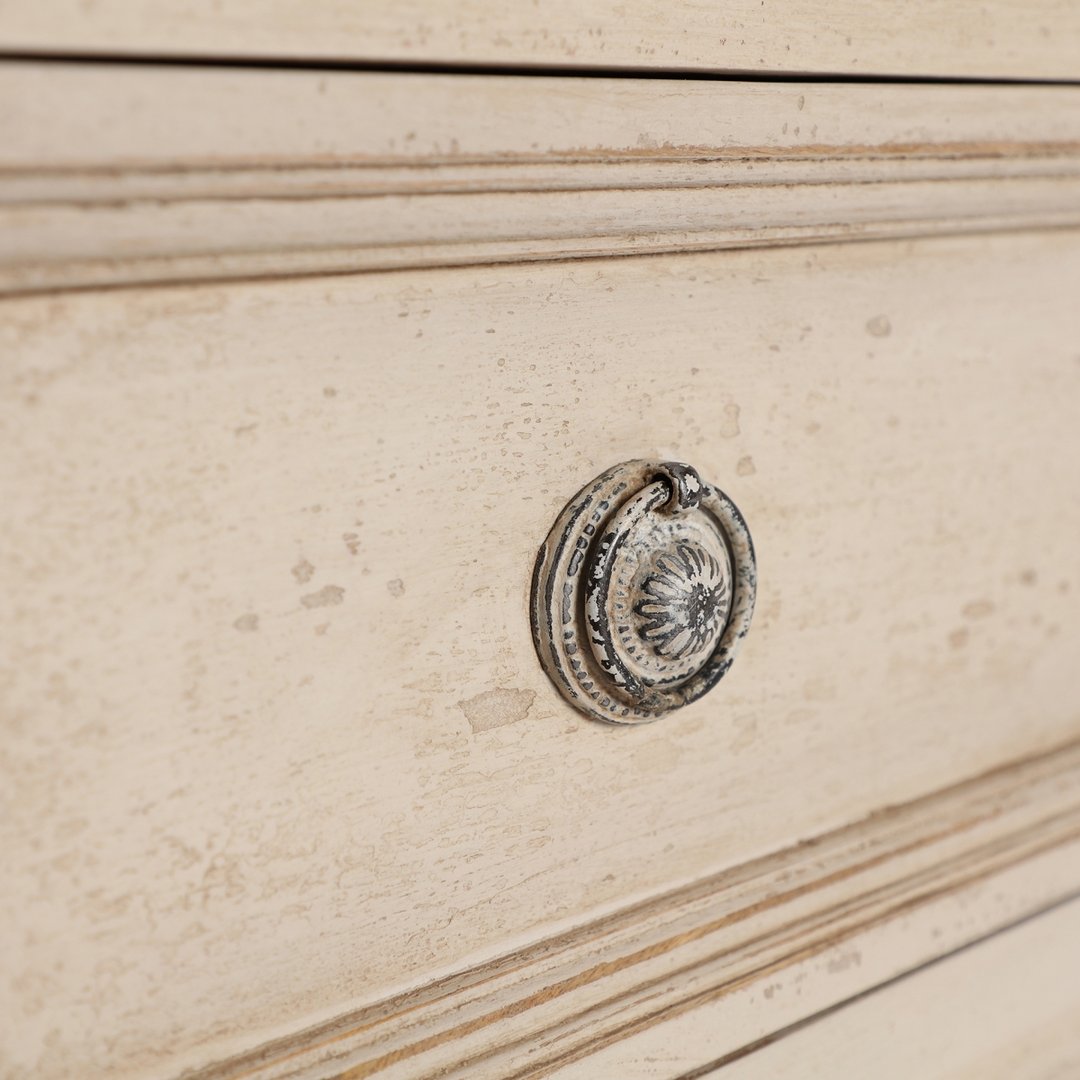 Realizzata in legno massello di mango e abbinata a legno DM, questa cassettiera offre un design affascinante in bianco sporco, tipico dello stile provenzale.