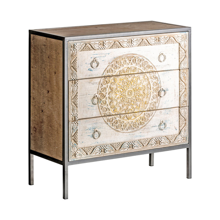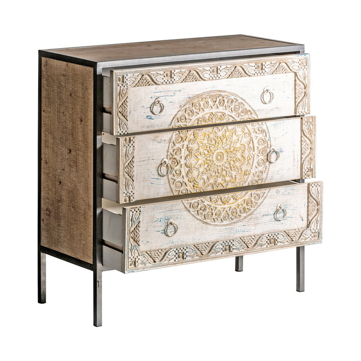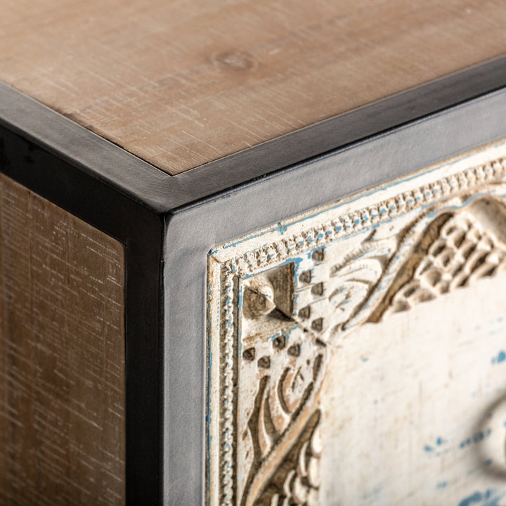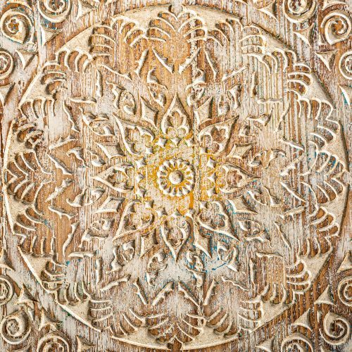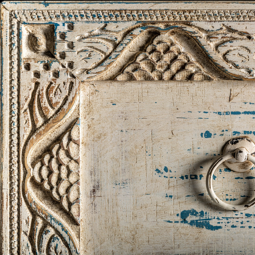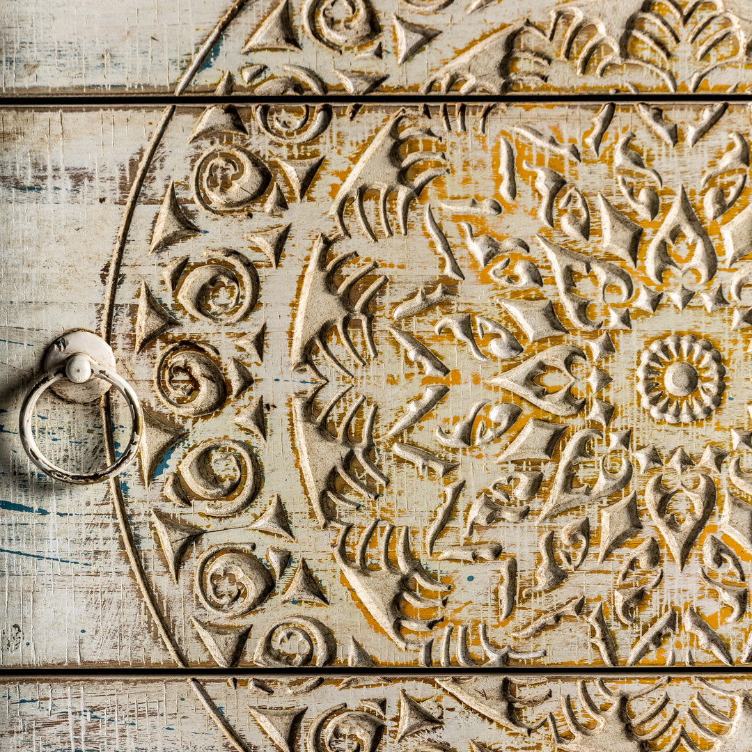 Il mandala e il bordo etnico scolpito sui frontali dei cassetti, dipinti nei toni dell'azzurro e dell'ocra, aggiungono un tocco esotico che rende questo pezzo un vero e proprio capolavoro.
