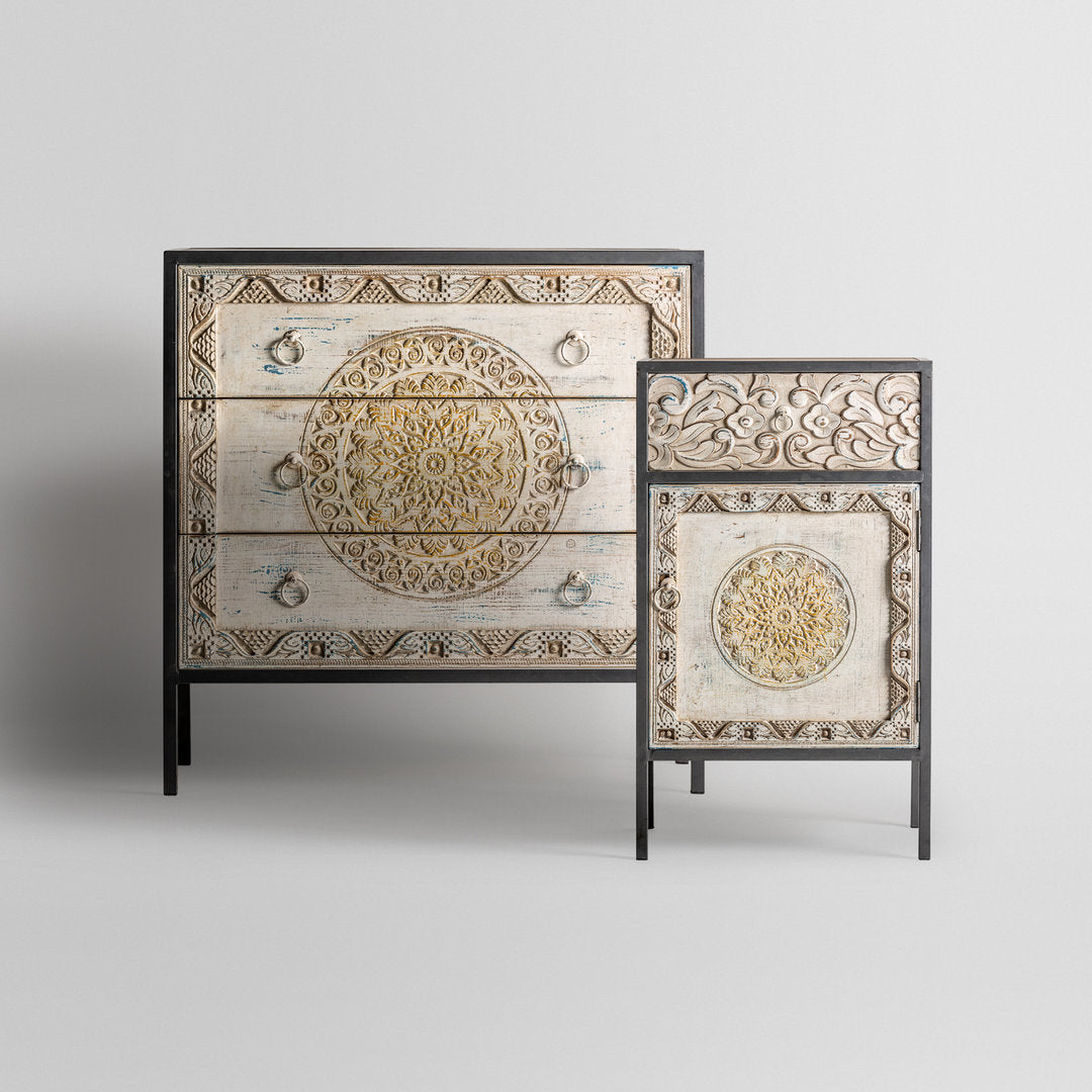 Questo comò, dal design etnico e industriale, unisce un aspetto imponente e la delicatezza dei suoi dettagli, creando un mobile organizzativo il cui fascino sedurrà gli amanti dei mobili etnici eleganti.
