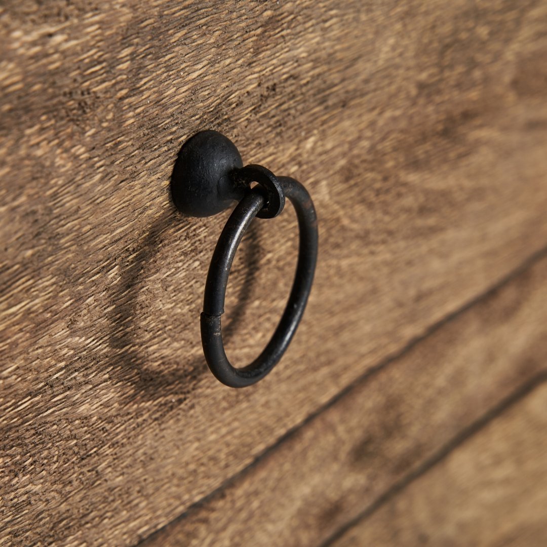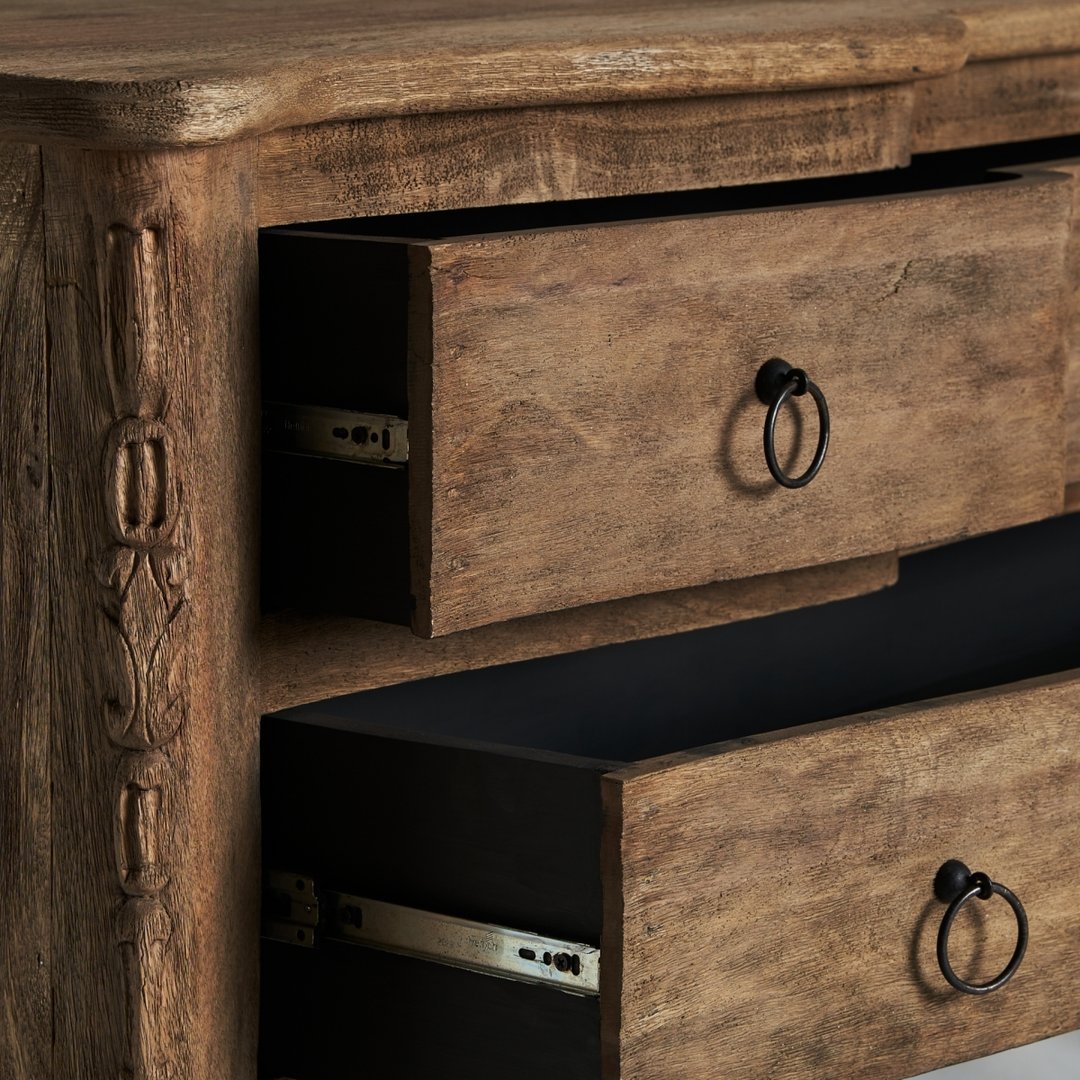 La nostra Cassettiera è fabbricata in legno di mango, noto per la sua bellezza naturale e la sua robustezza. La combinazione con dettagli in ferro aggiunge un tocco di fascino rustico ed elegante al mobile.