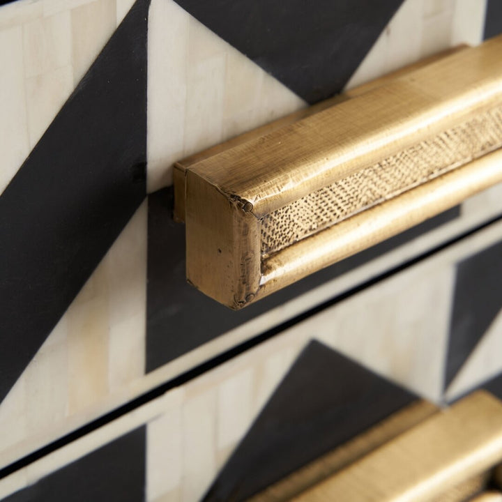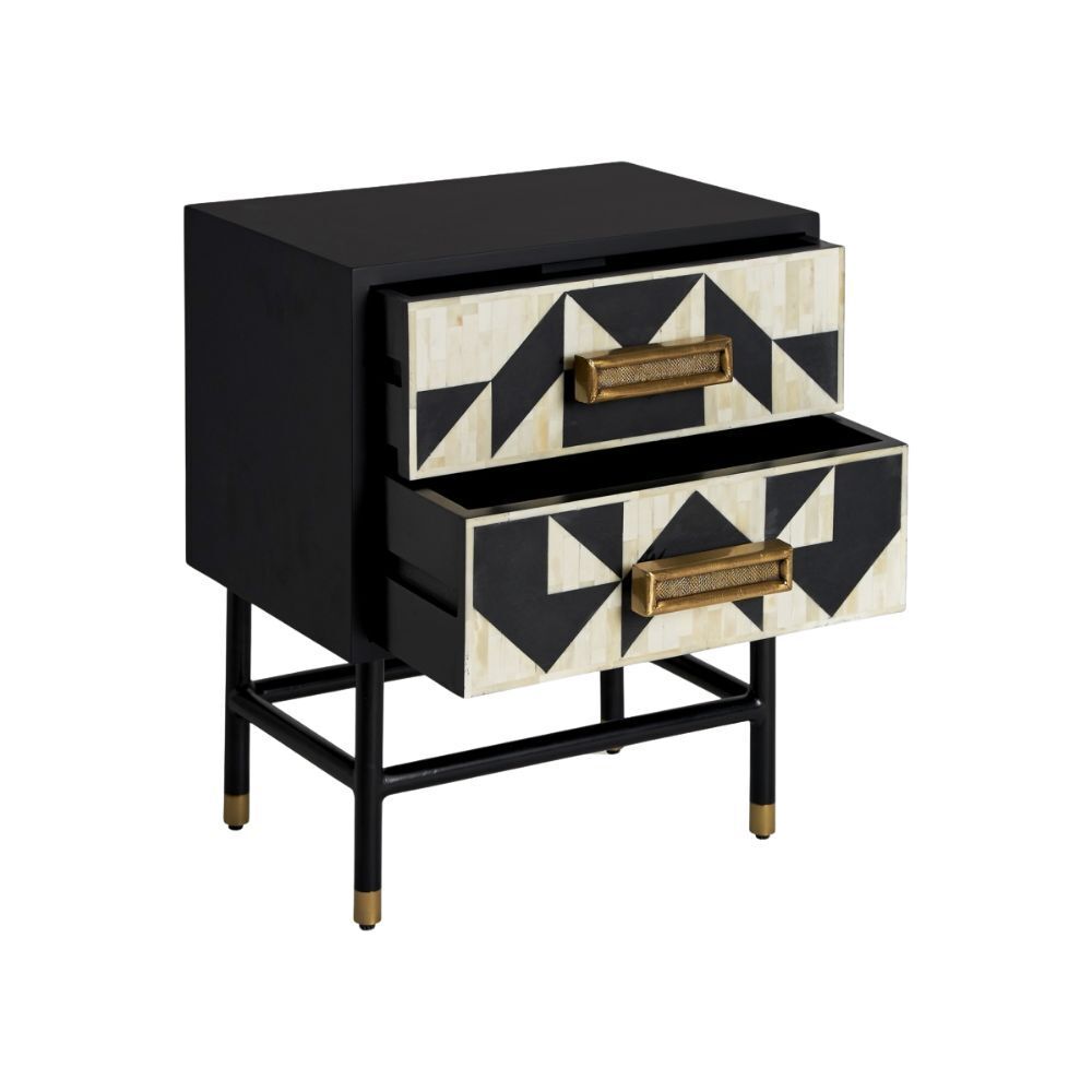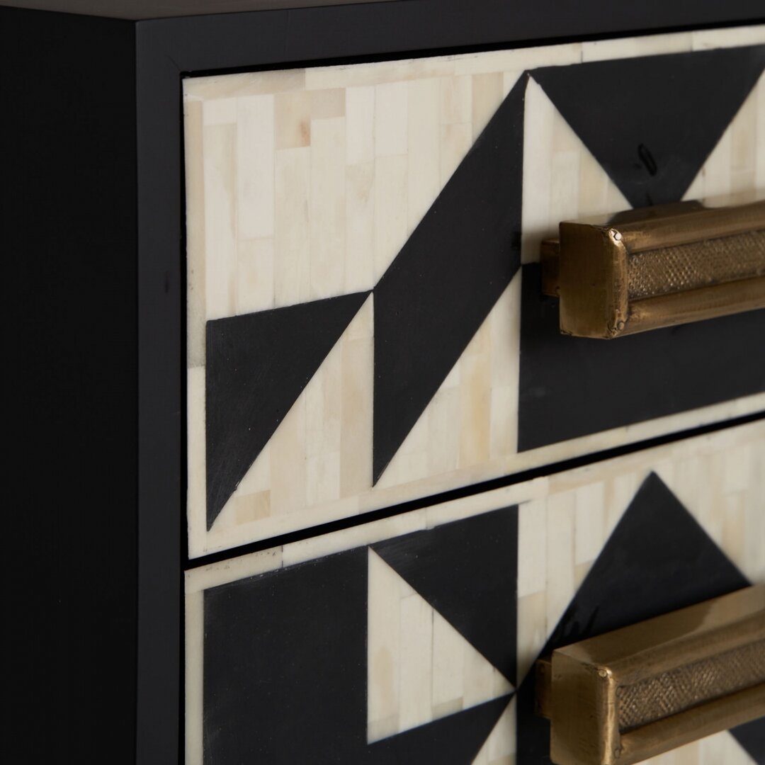 Un complemento d’arredo dallo stile Art Déco raffinato ed esclusivo, perfetto per aggiungere un tocco di eleganza e carattere alla zona notte o al soggiorno. Realizzato artigianalmente in ferro nero, è impreziosito da dettagli in osso bianco intarsiato, che creano un affascinante contrasto geometrico e donano un look sofisticato e lussuoso. La struttura solida garantisce resistenza e stabilità, mentre i cassetti spaziosi offrono un pratico spazio contenitivo per organizzare piccoli oggetti con stile. Ogni pezzo è unico, grazie alla lavorazione artigianale e alle naturali variazioni del materiale. Perfetto per ambienti in stile Art Déco, moderno o eclettico, si abbina splendidamente a mobili in metallo dorato, legno scuro o tessuti pregiati. Un elemento distintivo che unisce funzionalità e design senza tempo.