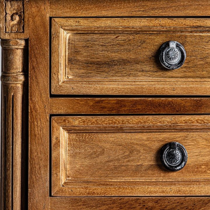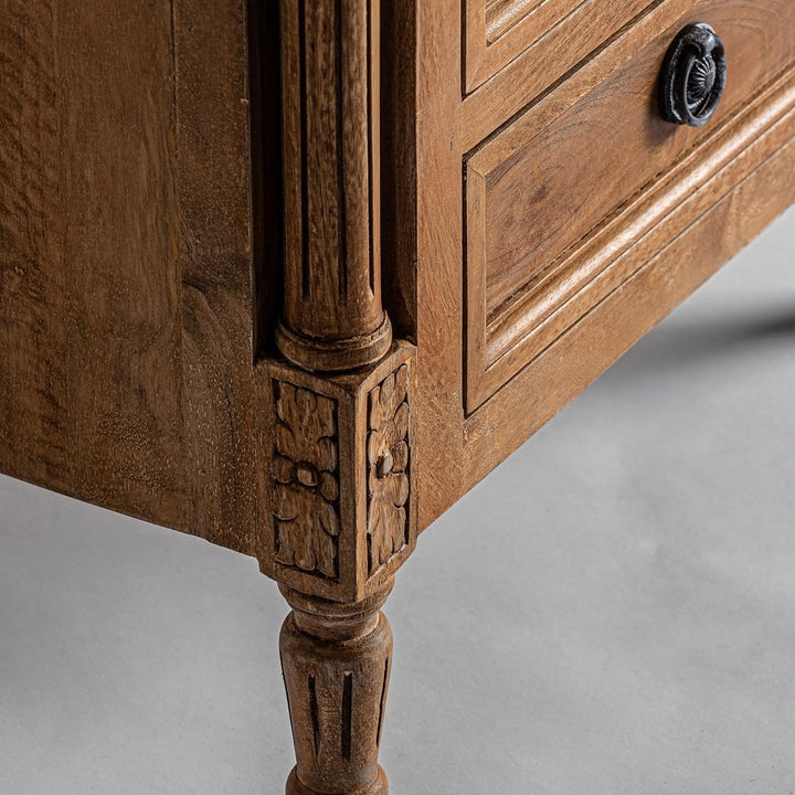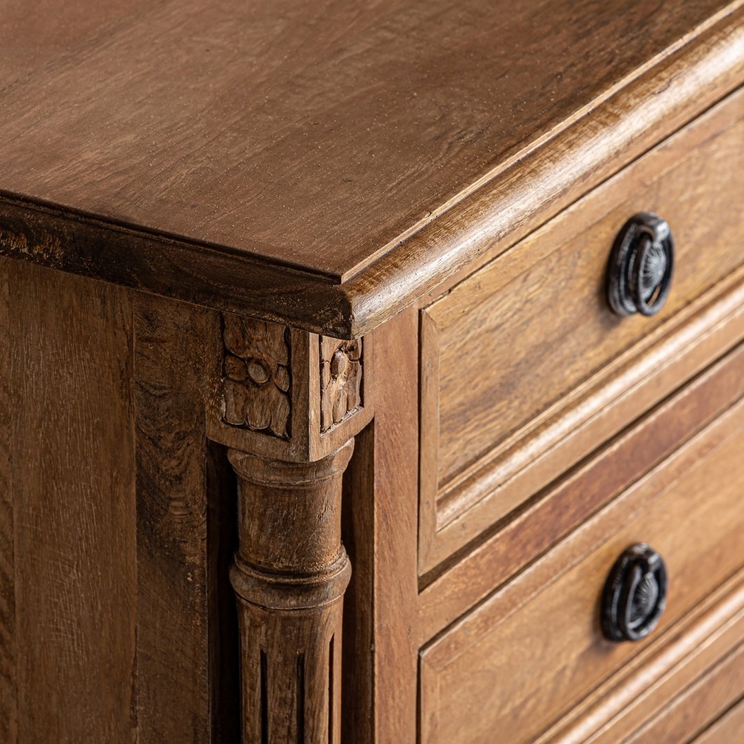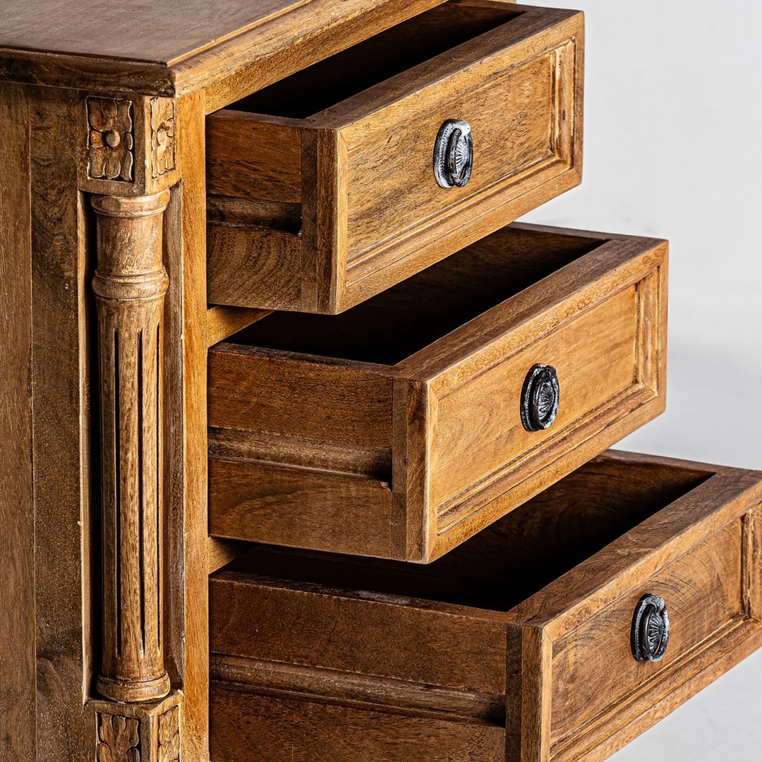 Scopri la bellezza naturale e l'autenticità del Tavolino Comodino, realizzato interamente a mano in legno massello di mango. Questo comodino, ideale per aggiungere un tocco di stile etnico alla tua camera da letto, vanta un colore naturale che evidenzia le caratteristiche uniche del legno, come venature e sfumature diverse, rendendolo un pezzo unico. Dimensioni: 50 cm di lunghezza, 40 cm di larghezza e 54 cm di altezza, con un peso di 15,2 kg. Dotato di 3 cassetti con guide in legno, offre una soluzione pratica per l'organizzazione quotidiana. Le gambe robuste misurano 4x4x12 cm, garantendo stabilità e supporto fino a 60 kg. La cura del tavolino è semplice: pulizia quotidiana con un panno sintetico e una miscela di acqua tiepida e sapone dolce. Aggiungi un tocco di vinagre per mantenere il legno lucido e accogliente. Esplora la nostra vasta gamma di mobili etnici e comodini in legno online per completare il tuo arredo con eleganza e funzionalità.