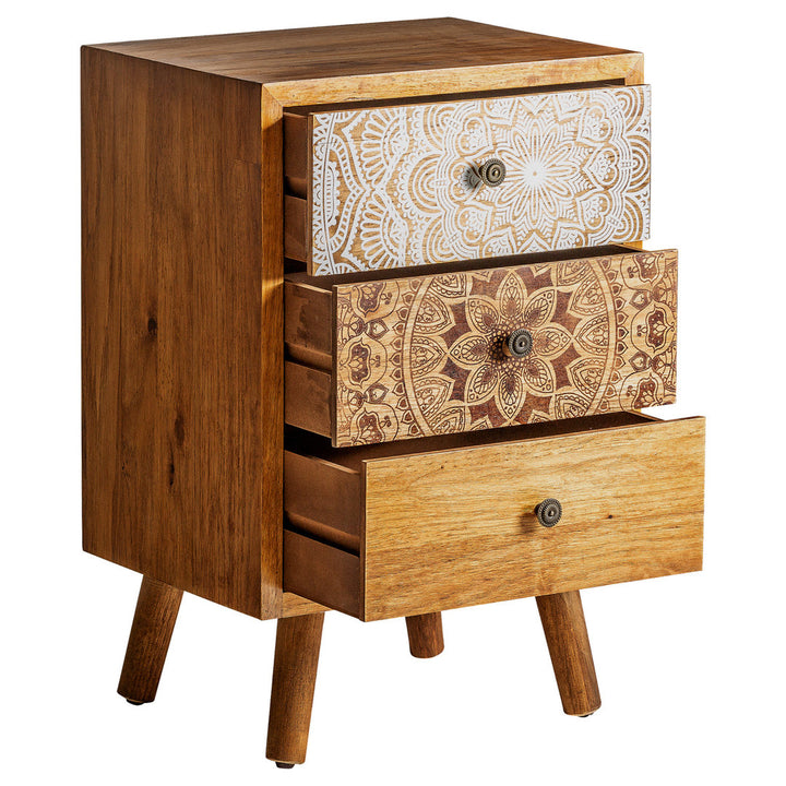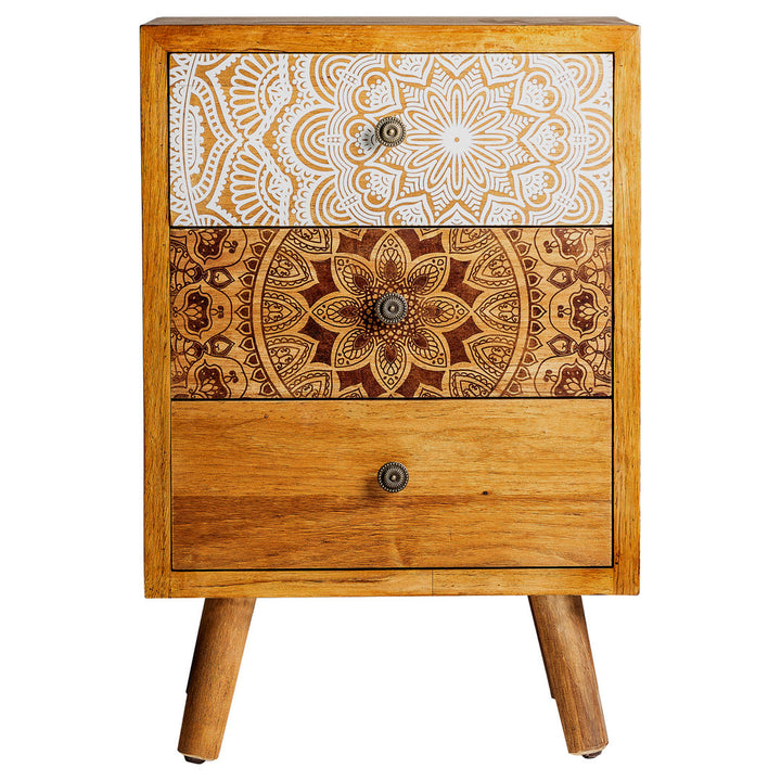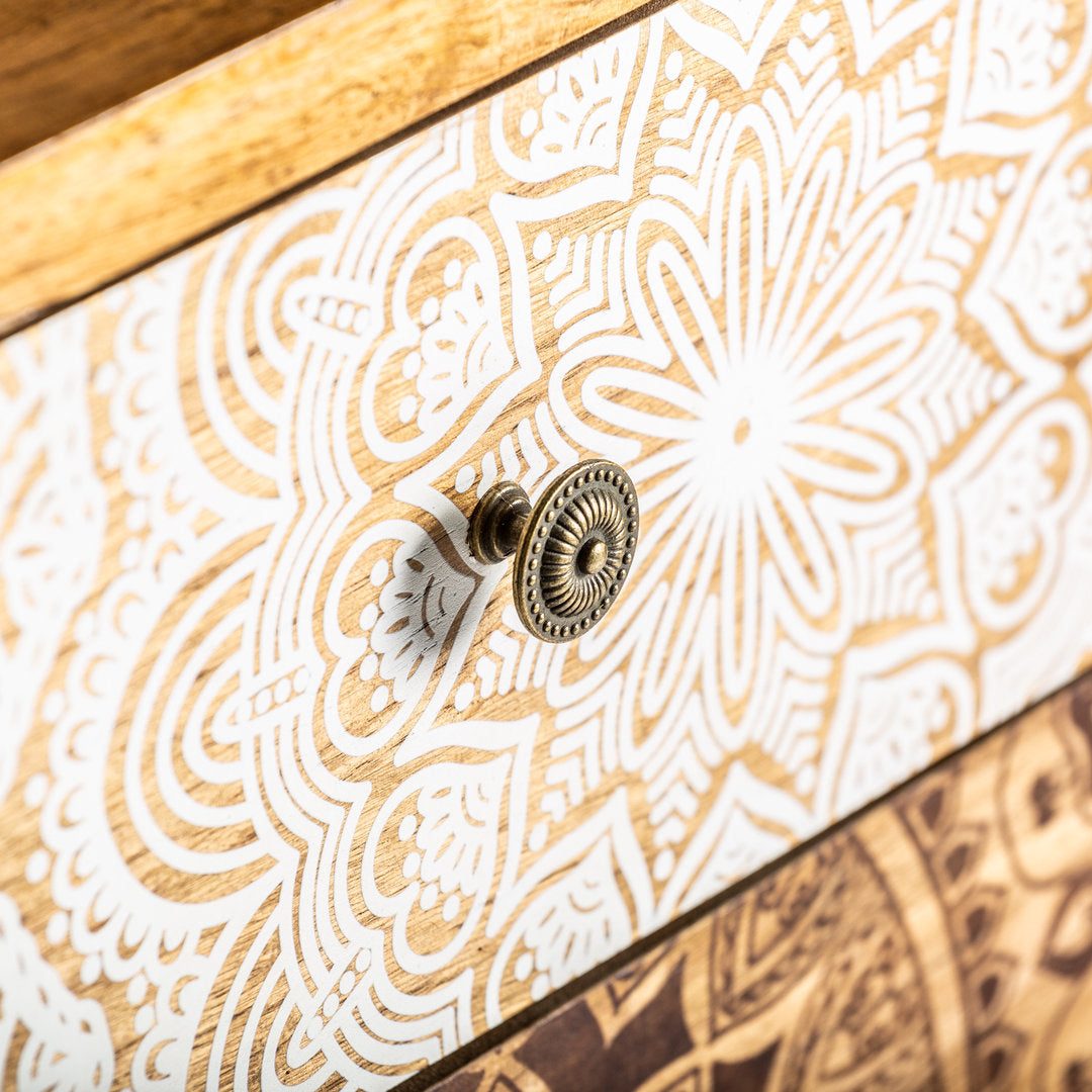 Il Comodino Stile Vintage Dipinto è un pezzo dal carattere distintivo per chi cerca vendita comodini etnici online. Creato con una struttura in legno di abete color rovere, questo comodino si distingue per i frontali dei suoi tre cassetti, artisticamente dipinti in bianco e marrone, che catturano l'essenza di un design sia etnico che vintage. Con le sue dimensioni contenute di cm 46 x 37 x H 69, questo comodino si adatta con grazia a qualsiasi ambiente, offrendo non solo uno spazio di stoccaggio pratico ma anche un elemento d'arredo pieno di personalità. Perfetto per accompagnare il tuo letto o per aggiungere un tocco artistico