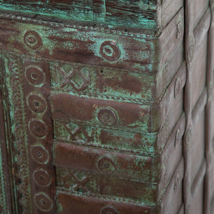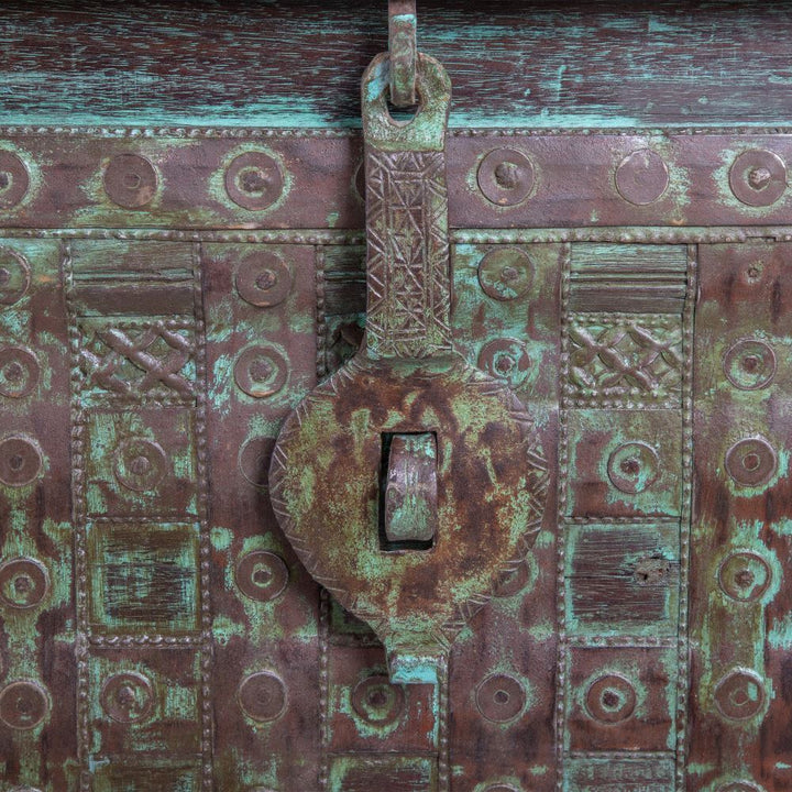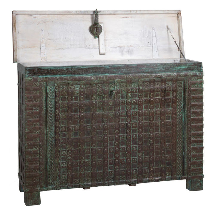 Immergiti nella storia e nell'arte con la nostra Consolle baule indiano anticato, un pezzo esclusivo che esalta l'artigianalità e l'unicità del design indiano. Realizzata in legno massello di mango, questa consolle è lavorata a mano, garantendo che ogni pezzo sia unico, con leggere variazioni che ne confermano l'autenticità e il valore. Il piano di lavoro naturale si sposa armoniosamente con la base verde anticata, creando un contrasto visivo che cattura l'attenzione e valorizza qualsiasi ambiente. Con dimensioni di 130 x 39 H 96 cm, offre una superficie robusta e spaziosa, ideale per ogni ingresso, salotto o camera da letto, aggiungendo un tocco di eleganza storica e raffinata al tuo spazio.