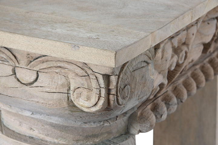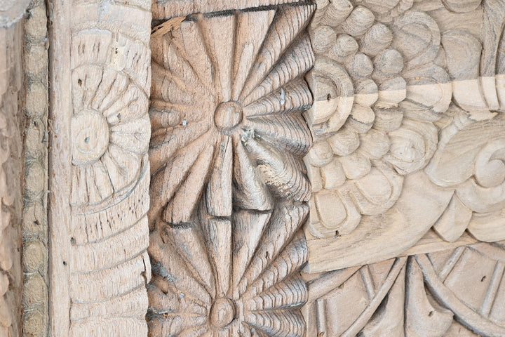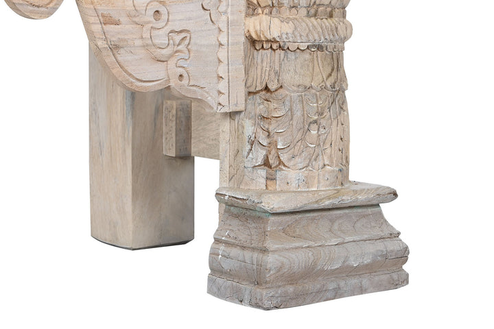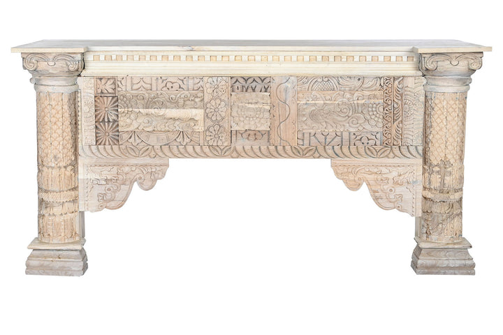 Questa magnifica consolle orientale indiana è un esempio eccezionale di artigianato tradizionale, realizzata interamente in legno massello di mango intarsiato. Con dimensioni di 180 x 55 cm e altezza di 90 cm, e un peso di 81 kg, questa consolle non è solo un pezzo d'arredo ma una vera e propria opera d'arte. Ogni dettaglio dell'intarsio racconta una storia, riflettendo la maestria degli artigiani che hanno lavorato minuziosamente per creare un design ricco e dettagliato. Le colonne robuste e le intricate decorazioni floreali e geometriche rendono ogni pezzo unico. Ideale per chi cerca consolle etniche scontate che offrano sia stile che funzionalità, questa consolle aggiunge un tocco di eleganza esotica e storica a qualsiasi ambiente, perfetta per l'ingresso o come punto focale in un soggiorno o sala da pranzo.