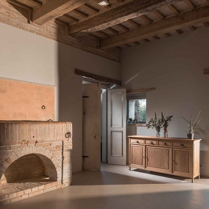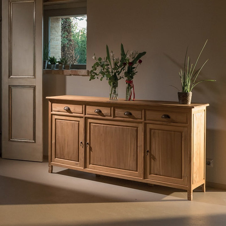 Il stile country chic si arricchisce con l'aggiunta della credenza in legno massello di teak naturale, lavorata artigianalmente per garantire unicità e qualità superiore. Dimensioni generose di L 180 x P 48 x H 95 cm, questa madia offre ampio spazio di stoccaggio con 3 ante e 4 cassetti, ideali per una casa ordinata e accogliente. La finitura a cera preserva le naturali caratteristiche estetiche del teak, esaltando il colore dorato e le venature con una ceratura manuale che sottolinea la bellezza intrinseca del legno. Per chi desidera un tocco più moderno, è disponibile la versione bianco decapé, realizzata con tecniche che mantengono le venature visibili e aggiungono luminosità agli spazi. Il supplemento del 20% per la variante decapata offre una scelta stilistica di grande impatto, perfetta per interni shabby chic ma adatta anche a contesti più classici e rustici. Questa credenza non è solo un pezzo di mobiliario, ma un'aggiunta di valore per ogni casa, testimoniando l'eleganza e la praticità del design artigianale.