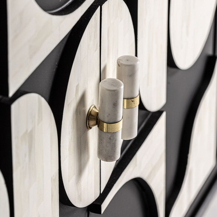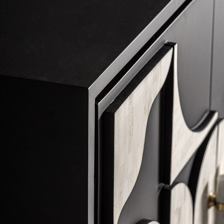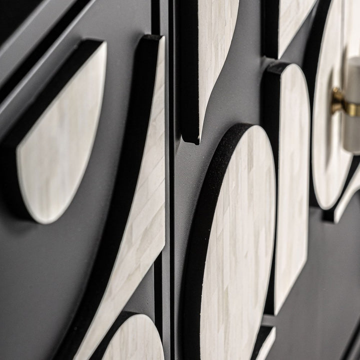 Lo stile eclettico contemporaneo unisce contrasto geometrico e artigianato raffinato, perfetto per creare atmosfere distintive in living o sale da pranzo dal gusto moderno. Il mobile eclettico contemporaneo è realizzato in legno MDF nero con intarsi in osso bianco e base in ferro nero, materiali che garantiscono stabilità e impatto estetico. Con misure di cm 160 x 40 x H 80, presenta quattro ante che si aprono su ampio spazio contenitivo, ideale per organizzazione di oggetti o decorazioni. Ogni pezzo è unico grazie a variazioni naturali e lavorazione manuale. Perfetto per ambienti eclettici, aggiunge esclusività e versatilità. Proposto con sconti fino al 70% su Ethnic Chic.