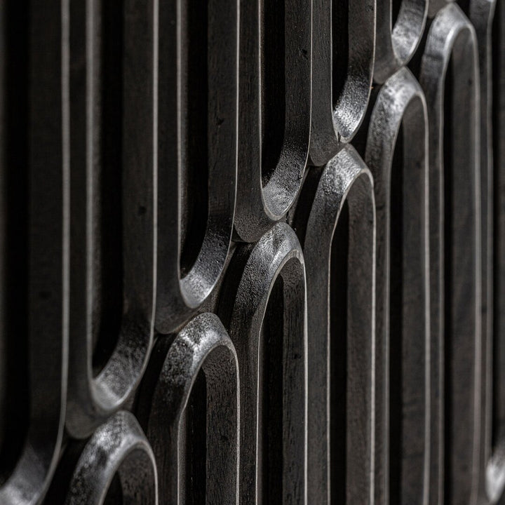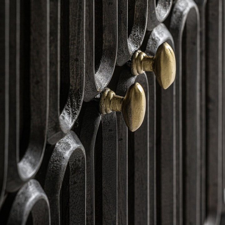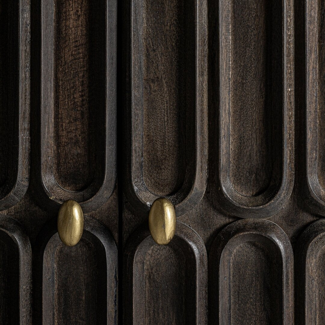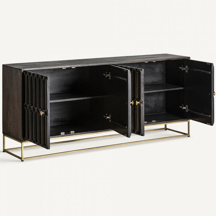 Il buffet di design richiama l'eleganza del design classico e la resistenza del legno massello, con una finitura marrone scuro impreziosita da dettagli dorati che aggiungono un tocco di raffinatezza. Ideale per chi cerca una combinazione di stile e praticità, questo mobile è perfetto per completare la sala da pranzo o il soggiorno. Realizzato in legno di mango con accenti in ottone, il buffet dispone di 4 ante che racchiudono due vani spaziosi, ognuno con misure di 81 x 33 x 58 cm. Ogni vano è dotato di mensola fissa, con un’altezza tra le mensole di 28 cm e una capacità di supporto fino a 15 kg per ciascuna. La struttura è sostenuta da piedini regolabili, con dimensioni di 1,5 x 1,5 x 16 cm, e una distanza tra i piedini di 176 x 35 cm. Lo spessore del piano è di 1,6 cm, con una capacità di carico totale di 80 kg. Il mobile include l’ancoraggio a parete per una maggiore stabilità, rendendolo una scelta perfetta per coloro che desiderano un buffet funzionale e di alta qualità, capace di elevare l'estetica della casa.