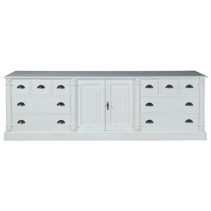 Il design provenzale shabby chic si riflette nella finitura bianco patinato e negli ornamenti delicati. Questa credenza è un'aggiunta perfetta a un arredamento che cerca una sensazione di eleganza vissuta.