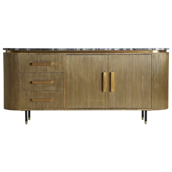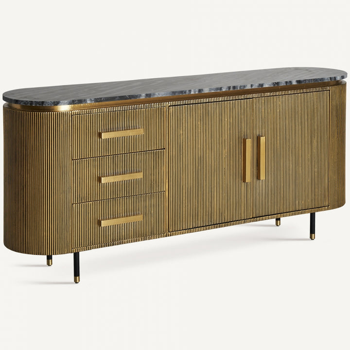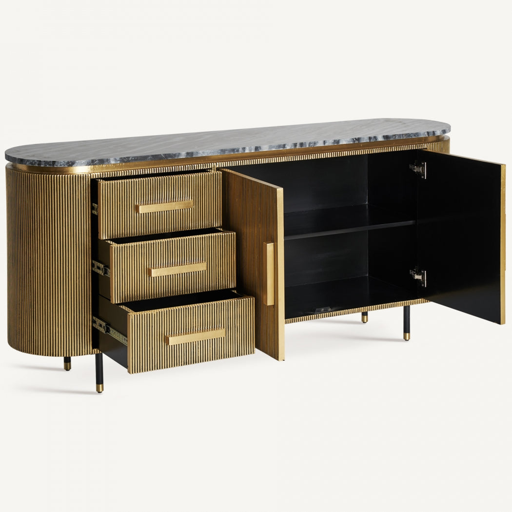 Lo stile Art Déco, sinonimo di raffinatezza e lusso, trova in questa credenza vintage una perfetta espressione moderna. Realizzata in legno MDF con un pregiato rivestimento in lamiera di ottone dorato, si abbina armoniosamente al marmo nero strutturato e al ferro nero verniciato a polvere. Questo mobile offre un mix unico di materiali che esalta la qualità e il design. Con dimensioni di 180 x 41 x 82 cm e un peso di 120 kg, la credenza è progettata per coniugare estetica e funzionalità. Dispone di 3 cassetti con dimensioni interne di 40 x 31 x 16 cm, 2 ante che nascondono uno spazio interno di 73 x 34 x 55,5 cm, e 1 ripiano fisso con altezza di 28 cm. La struttura, supportata da solide gambe staccabili in ferro, garantisce stabilità e durata. Ideale per ambienti moderni e sofisticati, questo buffet dorato è perfetto per chi cerca credenze di design, mobili in marmo e ferro, e un'eleganza senza tempo.