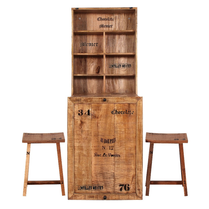 Sgabelli Comodi: I due sgabelli inclusi presentano sedute in legno con una barra centrale, offrendo un comodo appoggio per i piedi.