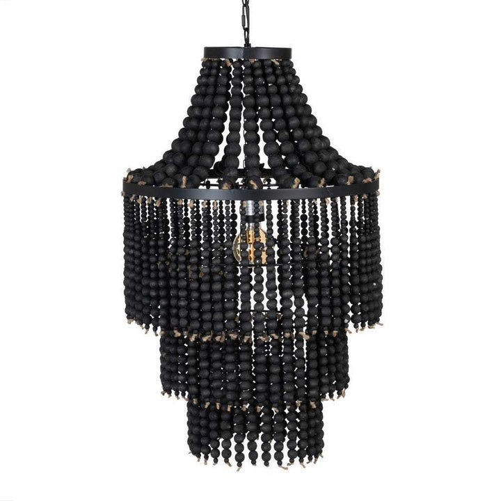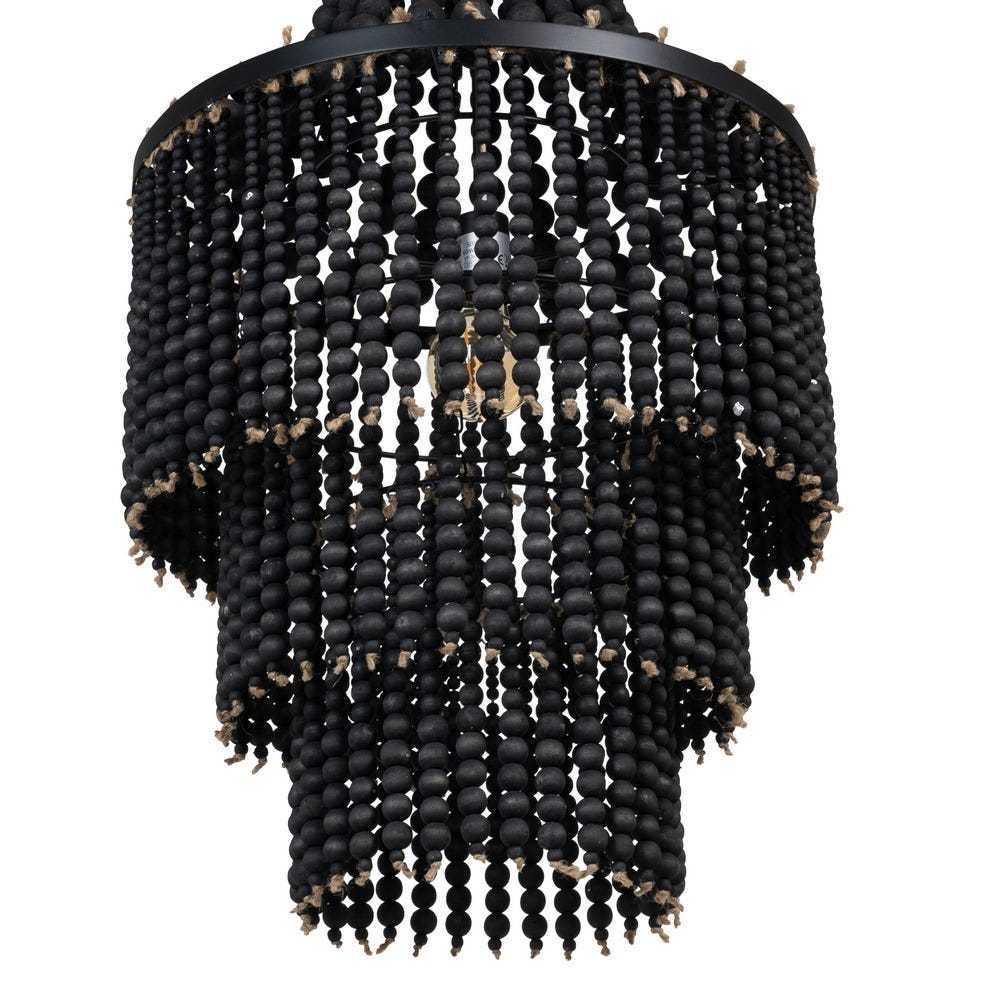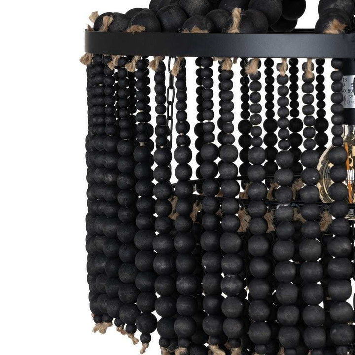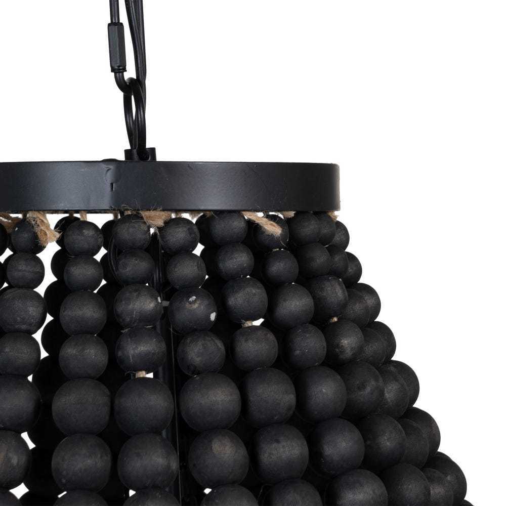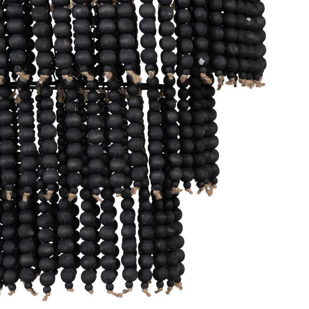 Realizzato con una struttura in metallo nero e arricchito da delicate perline in legno, questo lampadario è la scelta ideale per chi cerca un'illuminazione di carattere.