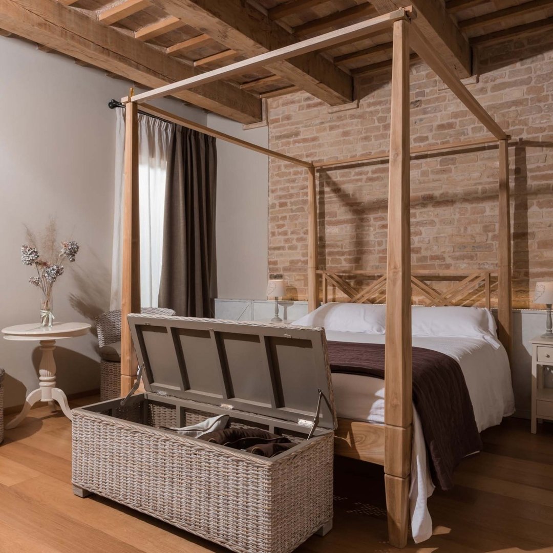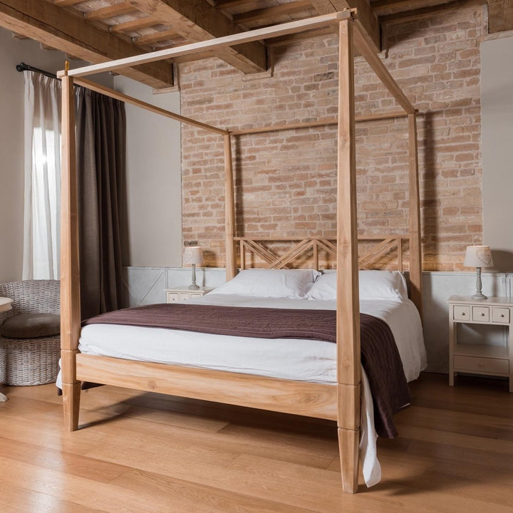 Un rifugio di serenità questo Letto Baldacchino Country, magistralmente realizzato in legno massello di teak naturale. Questo letto baldacchino non solo impreziosisce la tua camera da letto con il suo design maestoso, ma offre anche un ambiente di riposo unico e intimo. Dimensioni esterne: 173 cm di larghezza, 217 cm di profondità e 203 cm di altezza, con un'area interna di 162 x 200 cm, adatto a materassi matrimoniali standard. La finitura a cera naturale del teak preserva le sue qualità estetiche e funzionali, esaltando le venature dorate e migliorando la resistenza e durabilità del legno. È disponibile anche una versione più ampia del letto, misurante 193 cm di larghezza e 217 cm di profondità con un'altezza di 203 cm, e un'area interna di 182 x 200 cm, perfetta per chi cerca spazi più generosi. Questo letto è disponibile anche in una finitura teak sbiancato, aggiungendo un tocco di luminosità al tuo spazio con un supplemento del 20%. Completa il tuo arredo con questo letto baldacchino, ideale per una camera da letto in stile country chic, offrendo un equilibrio perfetto tra eleganza rustica e comfort contemporaneo.