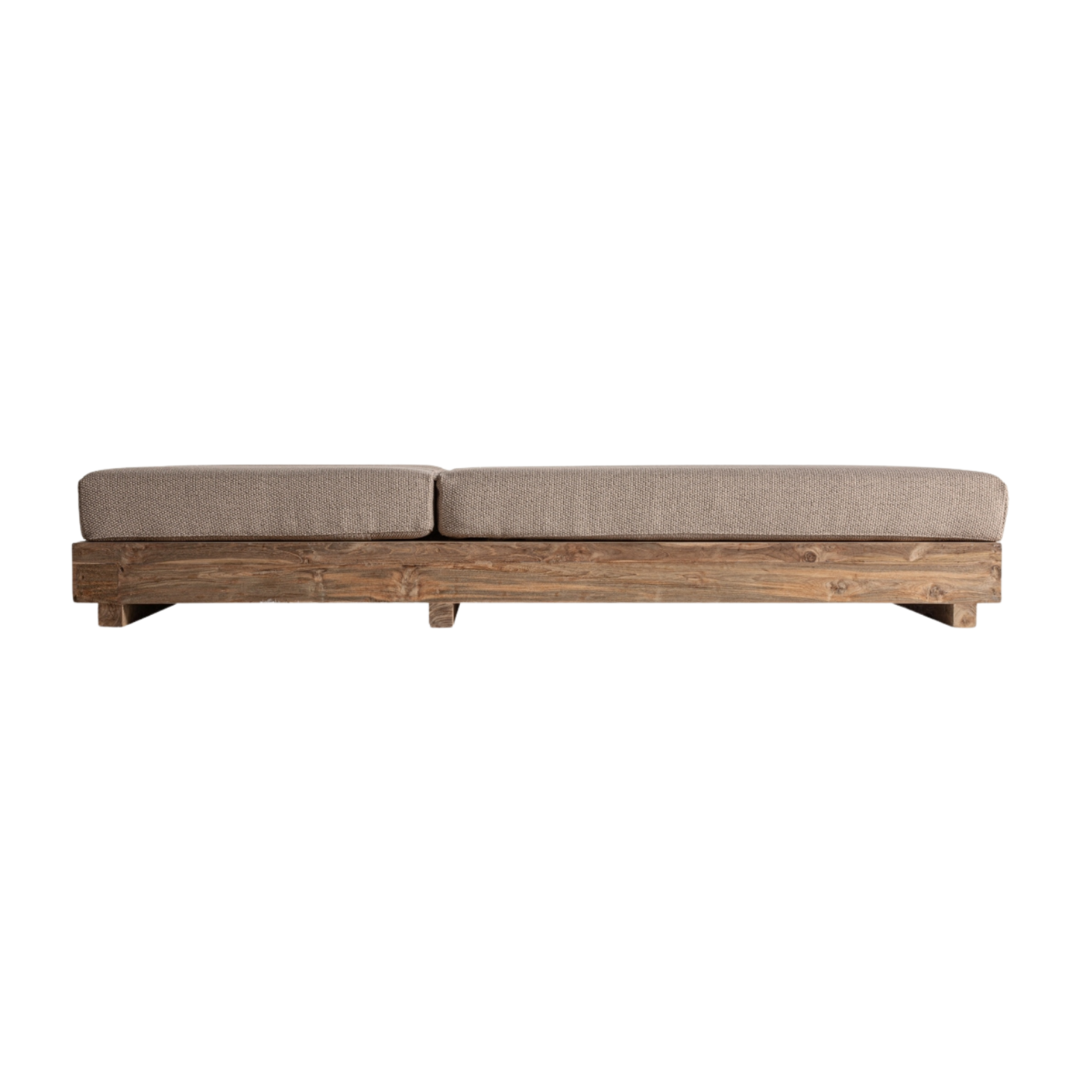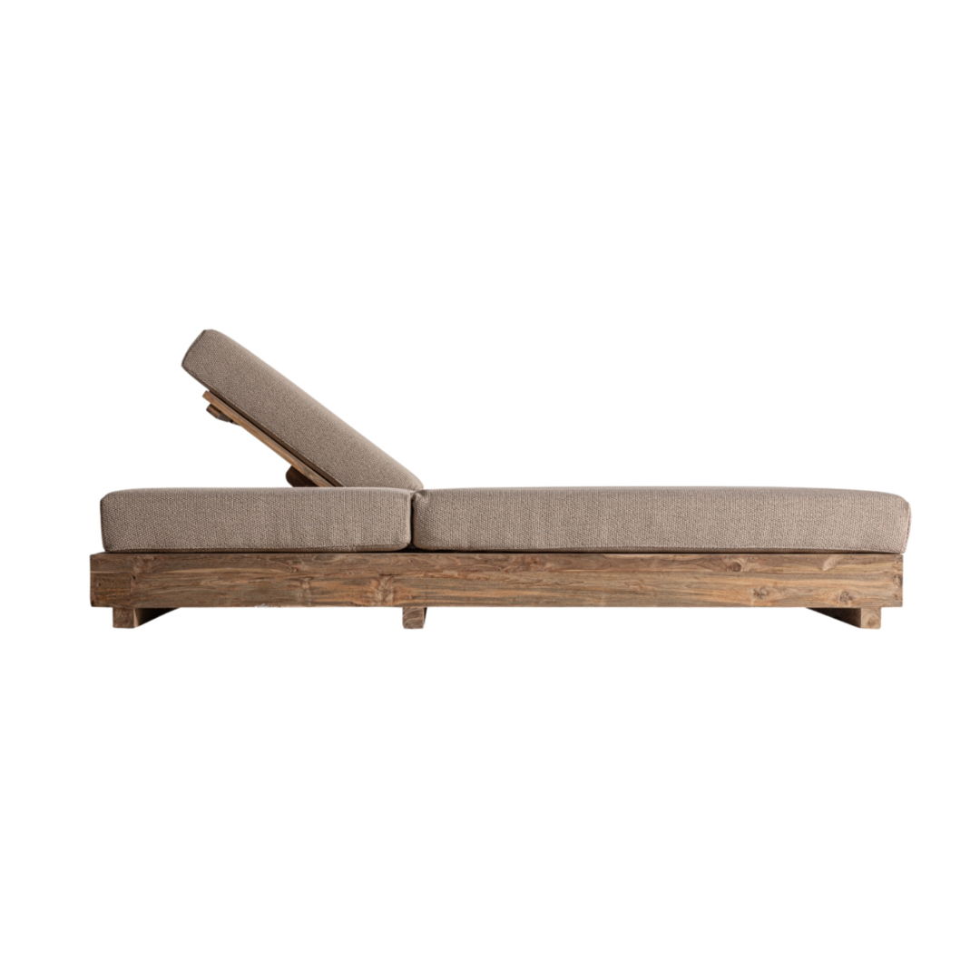 Perfettamente adatto per spazi outdoor eleganti e raffinati. Il suo stile combina elementi di design moderno con un tocco di chic rurale, evidenziato dall'uso di materiali naturali come il legno di teak. La struttura robusta e le linee pulite sono complementate da cuscini spessi e confortevoli che invitano al relax totale. Le funzionalità aggiuntive, come la capacità di regolare l'inclinazione dello schienale e lo spazio di stoccaggio integrato sotto il sedile, lo rendono non solo esteticamente piacevole ma anche pratico per l'uso quotidiano in ambienti esterni.Questo letto da giardino combina eleganza e funzionalità, ideale per arricchire qualsiasi spazio esterno. Realizzato con una robusta struttura in legno di teak riciclato, misura 160 cm di larghezza, 210 cm di profondità e 106 cm di altezza, offrendo spazio ampio e comfort superiore. Il design è accentuato da cuscini in polipropilene riciclato e espuma, con una dimensione di 160x212x14 cm, che assicura una seduta estremamente confortevole. Il peso del letto è di 108,6 kg e può supportare fino a 260 kg, rendendolo una scelta durevole e resistente per l'uso esterno. Dotato di piedini regolabili e uno schienale che si regola in quattro posizioni, questo letto offre versatilità e stile, perfetto per momenti di relax all'aria aperta.