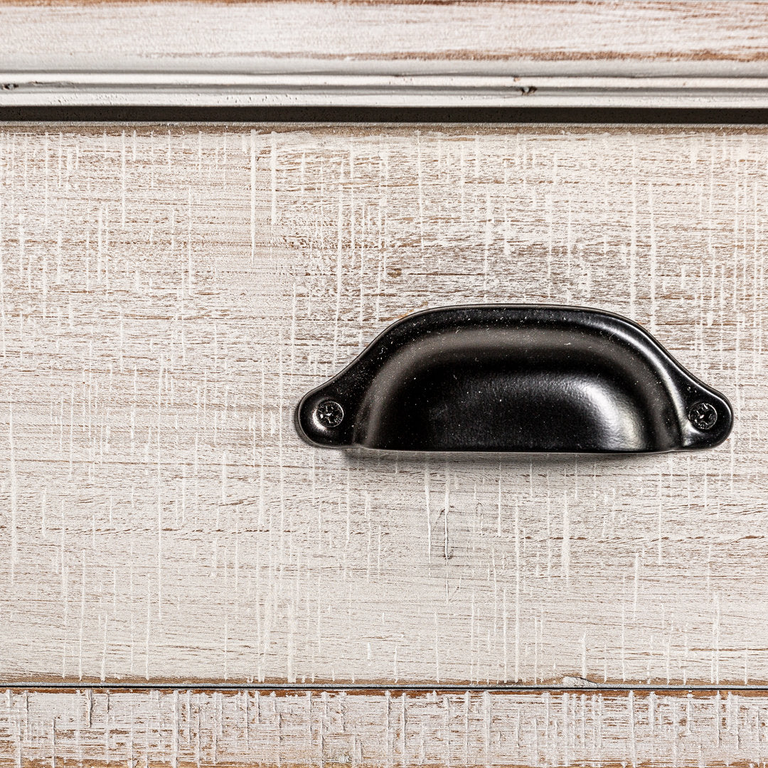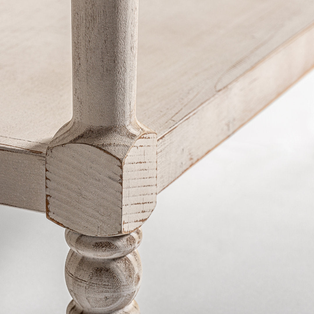 I mobili in legno patinato bianco, realizzati con una struttura del mobile in legno di abete, cassetti in DM e maniglie in ottone, esprimono un senso di calore e di storia. Le guide dei cassetti sono realizzate in legno, aggiungendo un ulteriore tocco di autenticità e qualità al pezzo.
