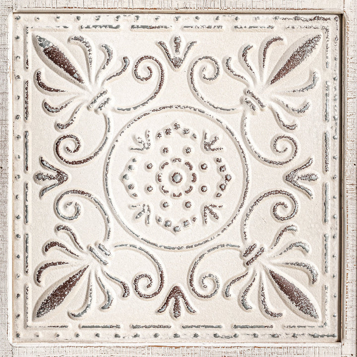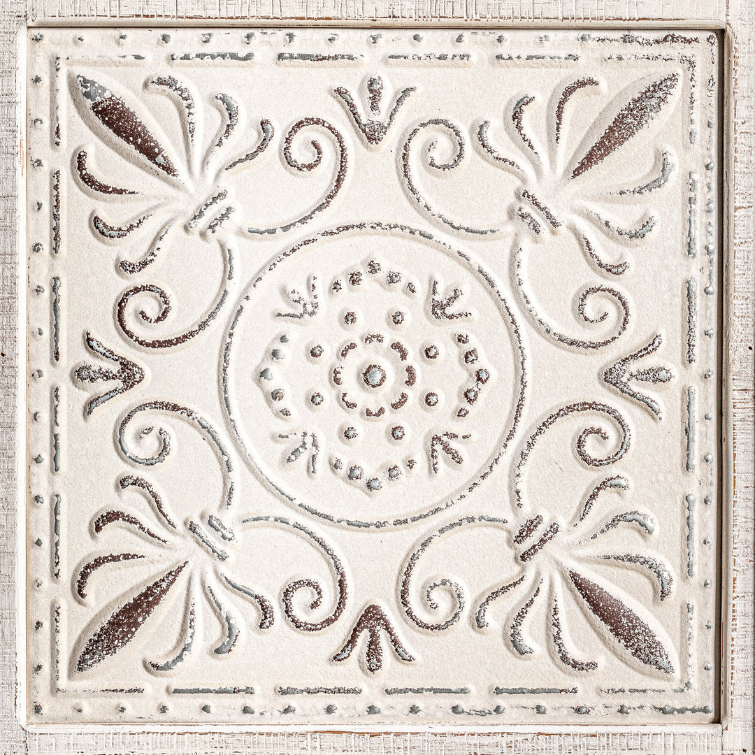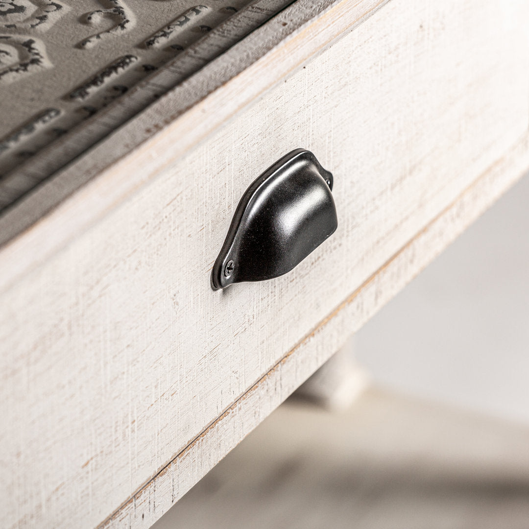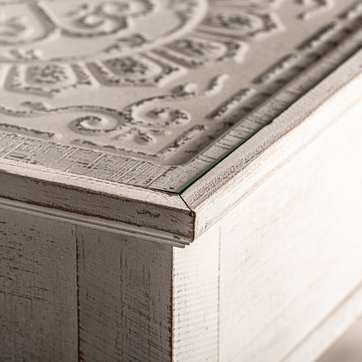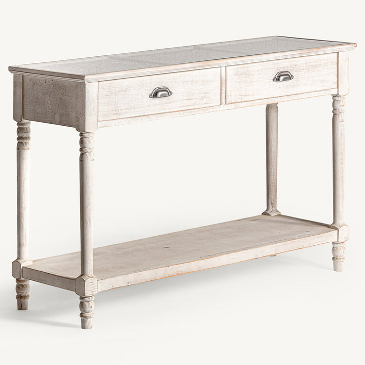 Ciò che rende questa consolle veramente speciale è l'originalità del suo piano, decorato con un disegno che simula le tipiche tegole. La finitura sbiancata e invecchiata si integra armoniosamente in qualsiasi ambiente, conferendo un tocco accogliente ed elegante.