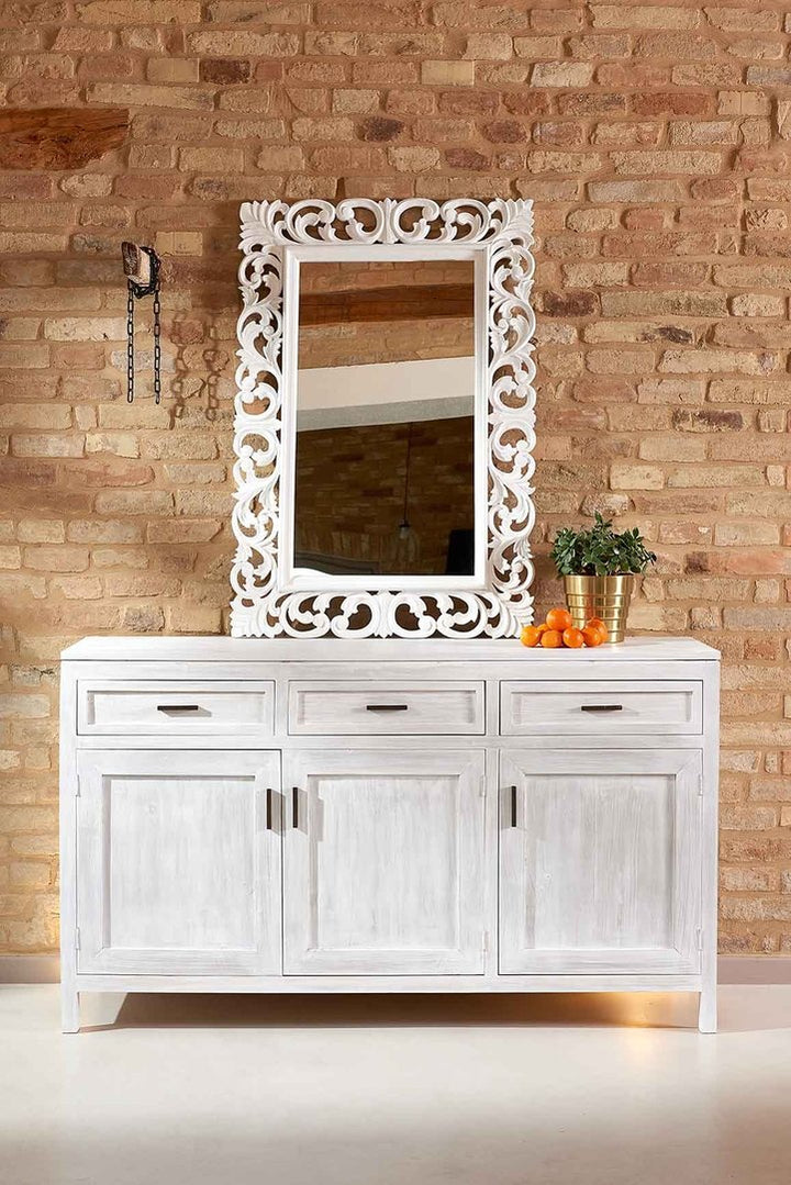 Il buffet in stile country chic si distingue per il suo design che combina la bellezza rustica con una finitura moderna e luminosa, perfetto per interni dal gusto classico, rustico, etnico o shabby chic. Questa versione in teak sbiancato, realizzata artigianalmente, misura L 155 x P 45 x H 90 cm e offre una capacità di stoccaggio ideale con 3 ante e 3 cassetti, oltre a un pratico ripiano interno. La finitura sbiancata, ottenuta attraverso un processo manuale che preserva le venature del legno, conferisce al mobile un aspetto fresco e accogliente, mentre le maniglie in ottone anticato arricchiscono il pezzo di un tocco di eleganza senza tempo. Questo buffet non solo ottimizza gli spazi, ma diventa una vera e propria dichiarazione di stile nell'arredo domestico, unendo funzionalità ed estetica in modo impeccabile.
