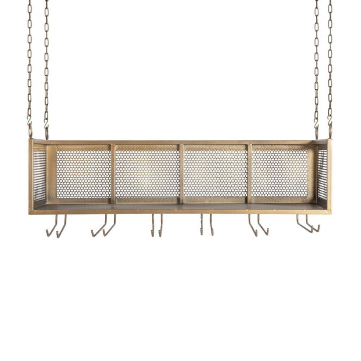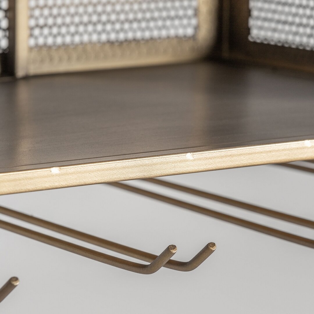 Realizzata interamente in ferro color oro, questa mensola bar sospesa si distingue per il suo design traforato e la struttura solida. Dotata di ganci portabicchieri e una pratica griglia contenitiva, permette di organizzare con stile calici e accessori da bar. Prodotto smontabile per un montaggio e trasporto agevoli. Non include il sistema di sospensione a parete. Per la pulizia, si consiglia di utilizzare un panno di cotone per preservare la finitura dorata. Perfetto per chi cerca un mobile bar sospeso raffinato e pratico, in grado di valorizzare qualsiasi ambiente.