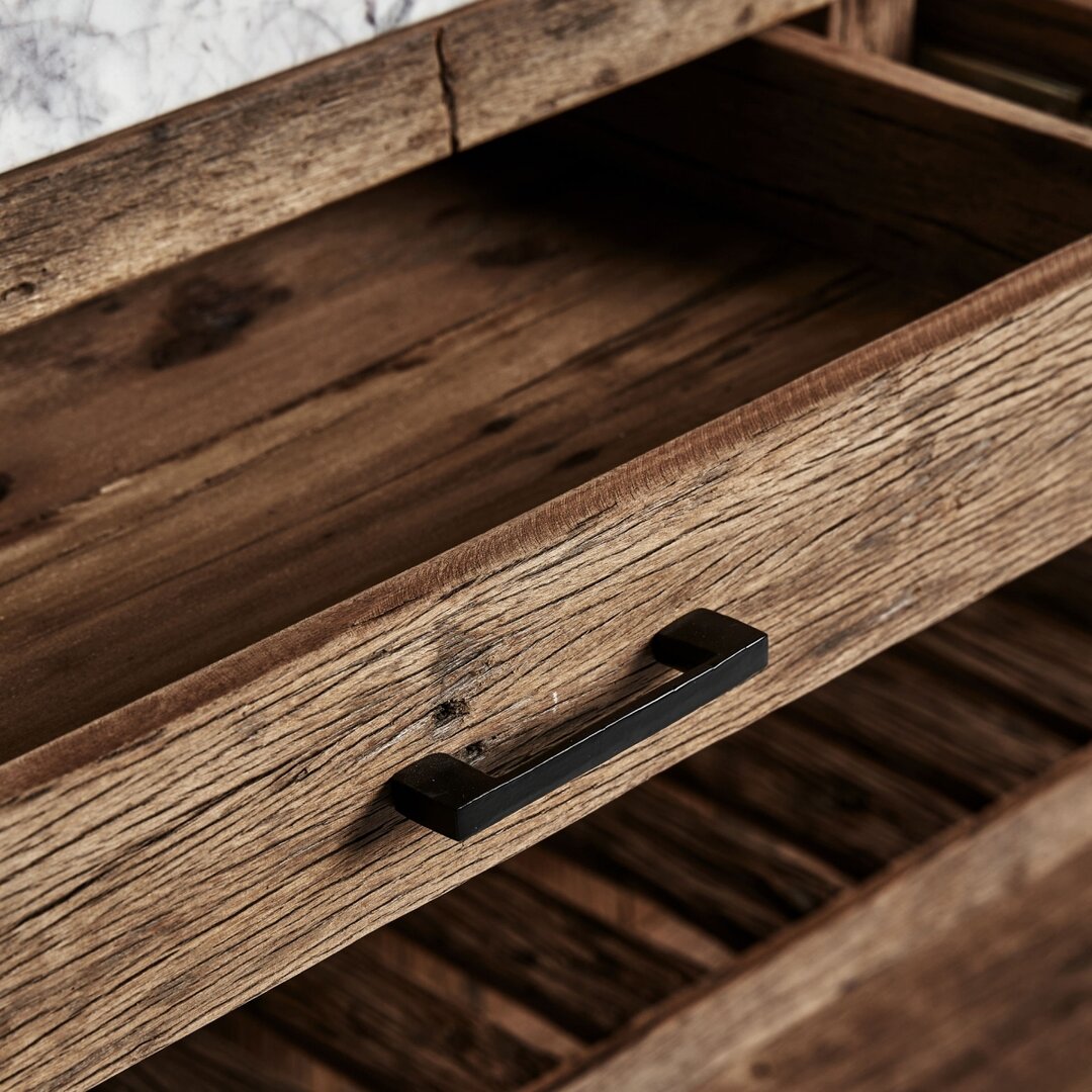 Realizzato in legno di pino riciclato con finitura nera invecchiata, il mobile presenta dettagli in ferro nero e un raffinato piano d’appoggio in marmo bianco. La struttura solida è pensata per garantire resistenza e praticità, con ampi spazi contenitivi, due cassetti, ripiani inferiori con listelli in legno per il posizionamento sicuro di bottiglie e bicchieri, oltre a una griglia sospesa porta-calici. Il mobile è staccabile per un trasporto e montaggio più agevoli. Ogni pezzo è fatto a mano, con finiture uniche che possono presentare leggere variazioni di colore e dettagli artigianali distintivi. Perfetto per creare un angolo bar funzionale e di grande impatto visivo.