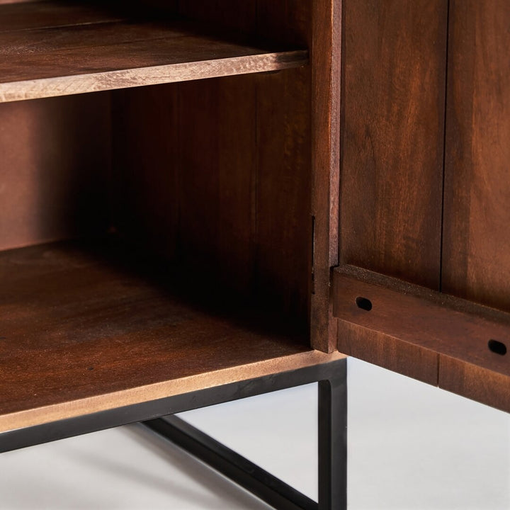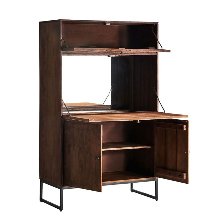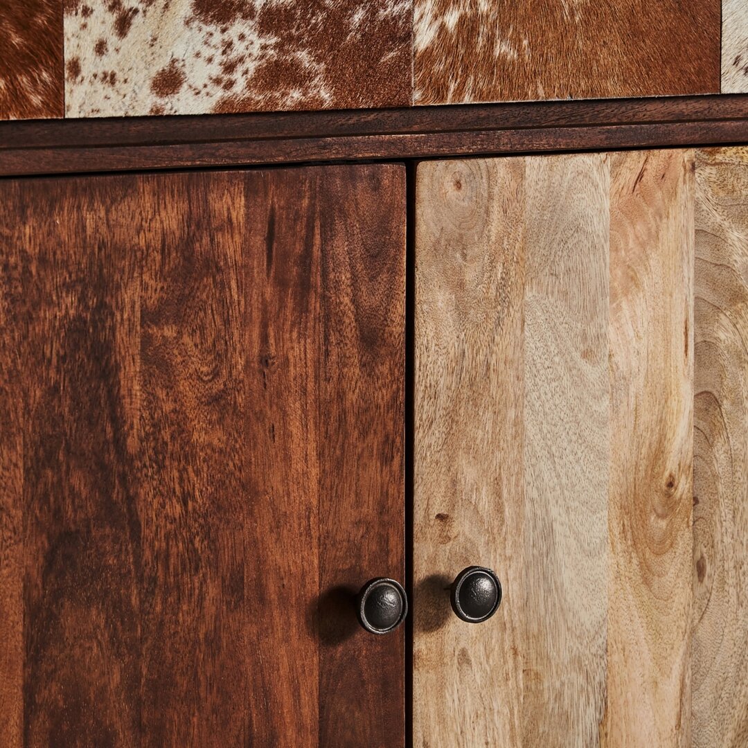 Realizzato in legno di mango riciclato marrone, è arricchito da dettagli in ferro battuto nero e inserti in pelle bovina nei toni del marrone, che ne esaltano lo stile texano. Il piano a ribalta offre una pratica superficie d’appoggio per la preparazione di drink, mentre la parte inferiore è dotata di ante e ripiani interni per riporre bottiglie, bicchieri e accessori da bar. Il design robusto e la lavorazione artigianale rendono ogni pezzo unico, con leggere variazioni di tonalità e segni naturali del materiale che ne valorizzano l’autenticità. Un complemento perfetto per creare un angolo bar esclusivo e raffinato.