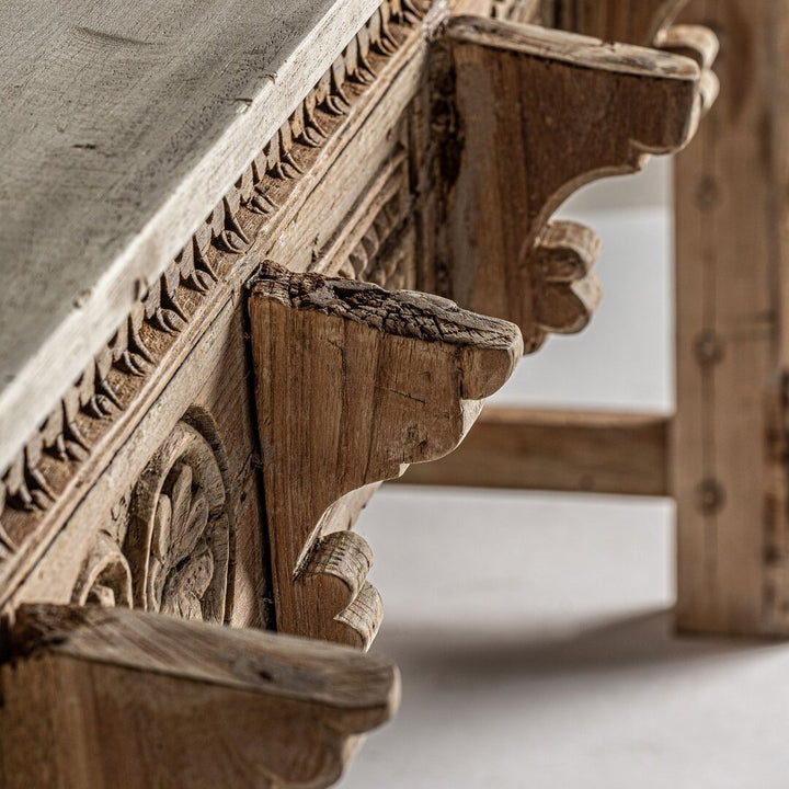 Lo stile etnico decapato unisce autenticità e fascino rustico, perfetto per chi desidera arredare i propri spazi con mobili che raccontano una storia unica. Questa consolle artigianale, realizzata in legno massello di mango, incarna la bellezza del design etnico con una finitura marrone invecchiata che esalta le venature naturali del legno. Le dimensioni di 162 x 51 x 76 cm, un peso di 32,5 kg e uno spessore del piano di 2 cm garantiscono robustezza e funzionalità. Le gambe di 6 x 6 x 7,5 cm, con uno spazio tra esse di 143 cm, offrono equilibrio strutturale. Ideale come mobile ingresso, consolle soggiorno o complemento d'arredo etnico, è un pezzo unico che porta con sé un mix di tradizione e stile contemporaneo, perfetto per valorizzare ogni ambiente.