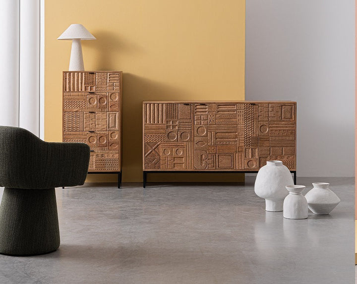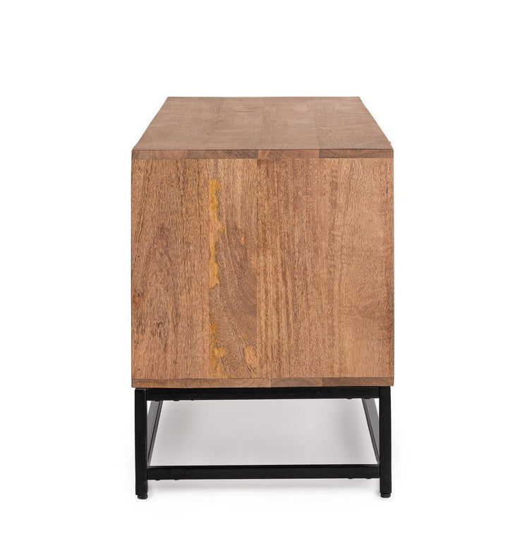 Questo mobile porta TV etnico è realizzato in legno massello di mango, caratterizzato da un frontale con cassetti e ante intarsiate a mano. La struttura robusta è completata da uno schienale in MDF e una verniciatura a base di nitrocellulosa, che esalta le venature naturali del legno. Le gambe e le maniglie in acciaio donano stabilità e un tocco contemporaneo al design etnico.