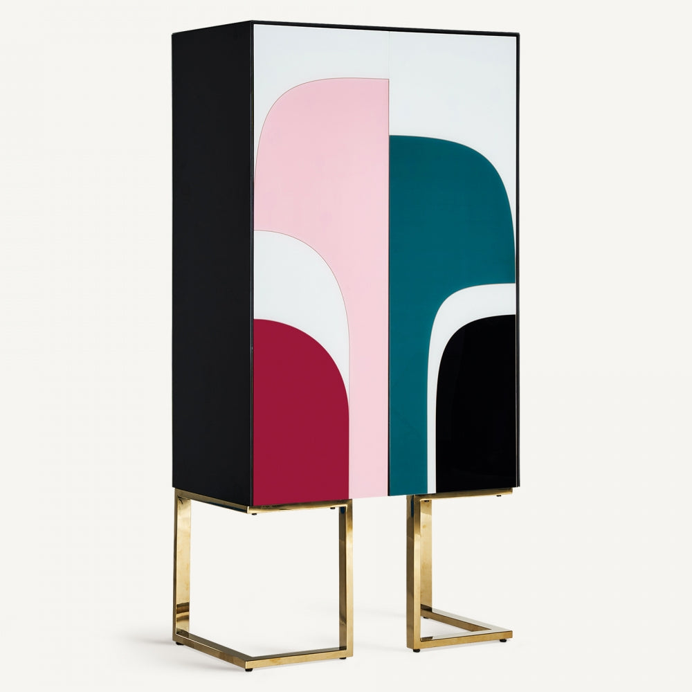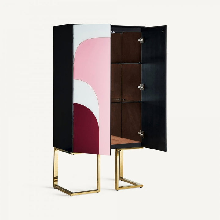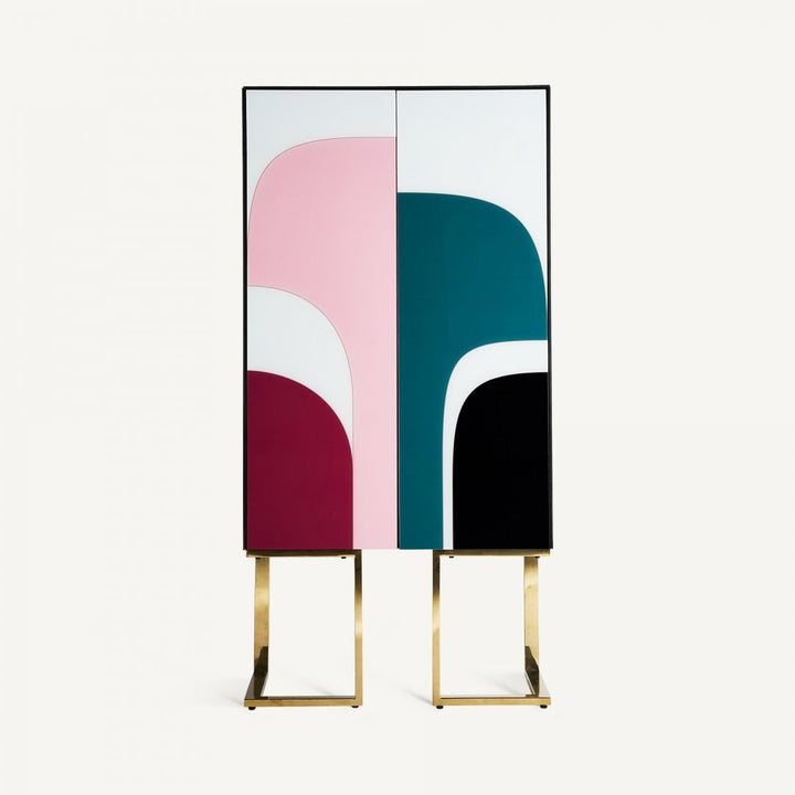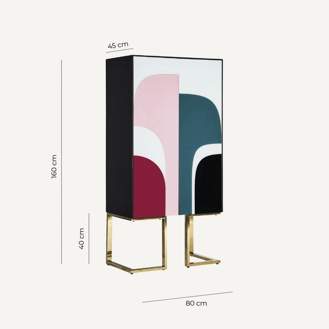 Ispirato allo stile Art Déco, questo mobile unisce ferro dorato, vetro e legno in un design iconico e funzionale. Le sue linee geometriche e i dettagli raffinati lo rendono una vera opera d'arte, perfetta per chi cerca un tocco di eleganza retrò nel proprio soggiorno. Con due porte scorrevoli e ripiani interni regolabili, il mobile offre ampio spazio per organizzare oggetti e decorazioni, supportando fino a 15 kg per ripiano. Le gambe in ferro dorato aggiungono stabilità e un tocco moderno, esaltando l’estetica senza tempo del design Art Déco. Ideale per arricchire qualsiasi ambiente con uno stile unico e sofisticato.