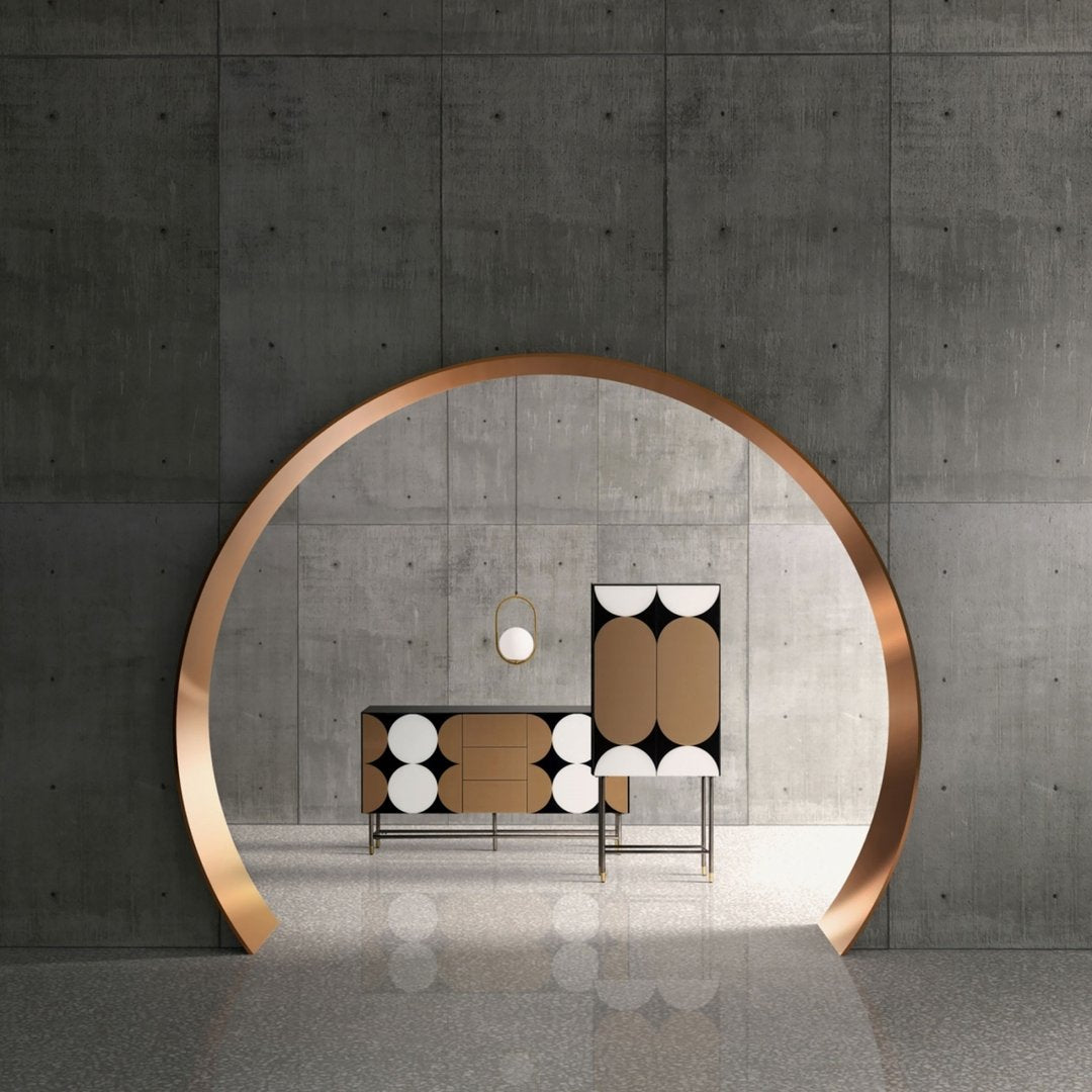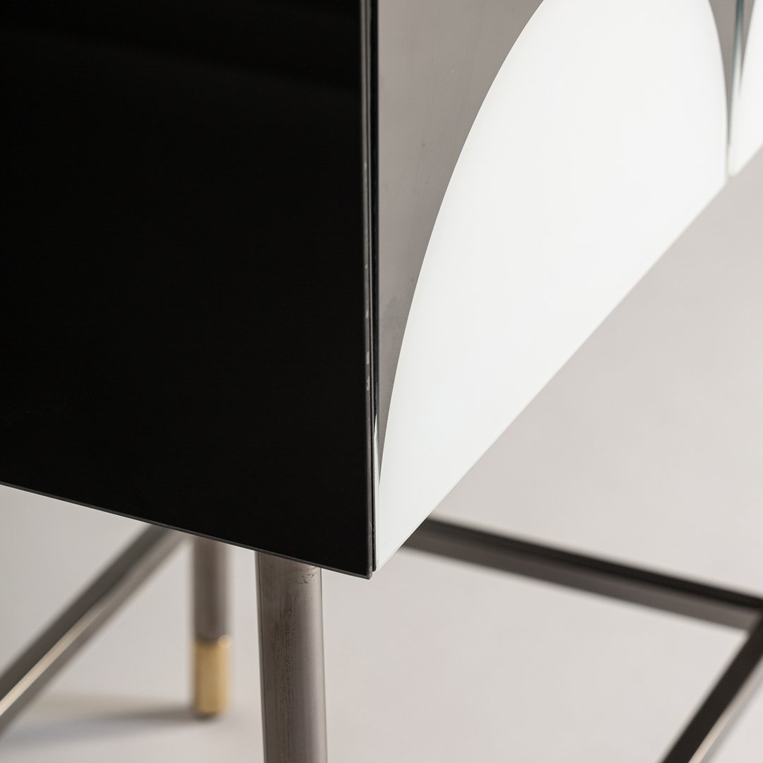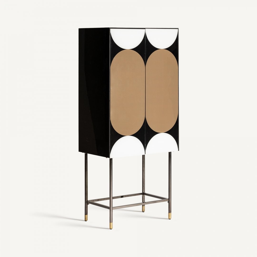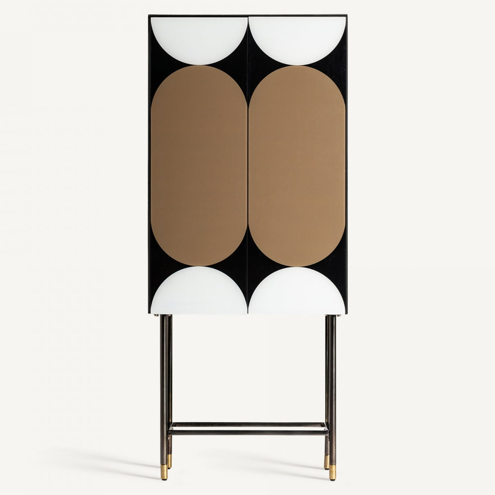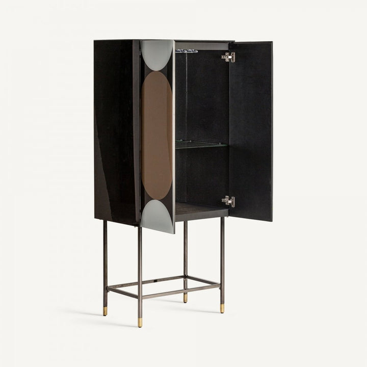Lo stile Art Déco incontra l'influenza del Bauhaus in questo mobile, combinando legno nero, ferro dorato e vetro in un design elegante e funzionale. Le porte in vetro bianco e le gambe in ferro con finiture dorate aggiungono un tocco sofisticato, perfetto per ambienti contemporanei. Con un interno spazioso e un ripiano regolabile, offre versatilità nell’organizzazione degli oggetti. Le gambe assicurano stabilità e contribuiscono al fascino unico del mobile. Ideale per chi cerca una soluzione che unisca estetica raffinata e praticità, questo pezzo arricchisce il soggiorno con uno stile distintivo e moderno.
