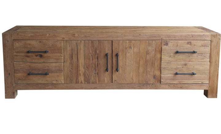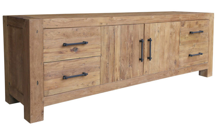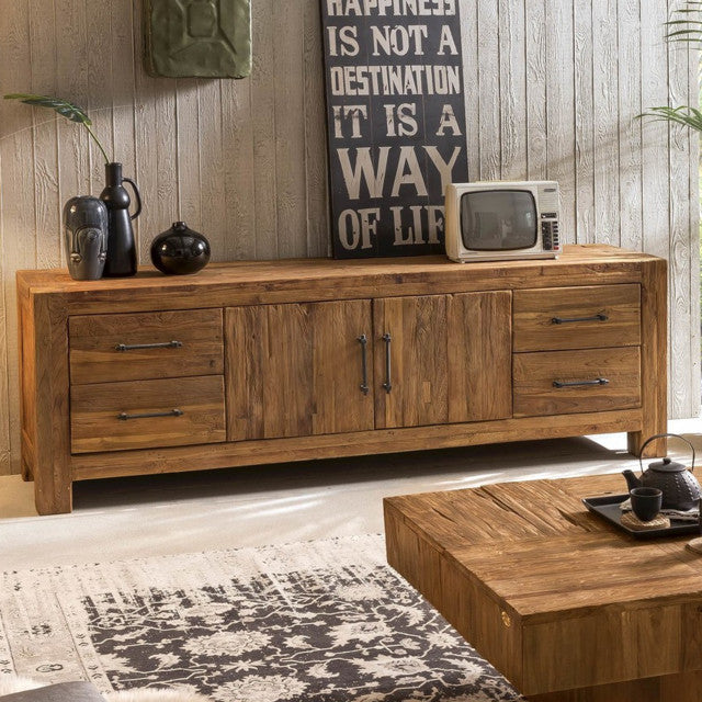 Mobili realizzati in teak stagionato recuperato da antiche case indonesiane, da tonalità naturali e la superficie spazzolata donano un fascino unico al mobile che lo distingue dal legno nuovo.