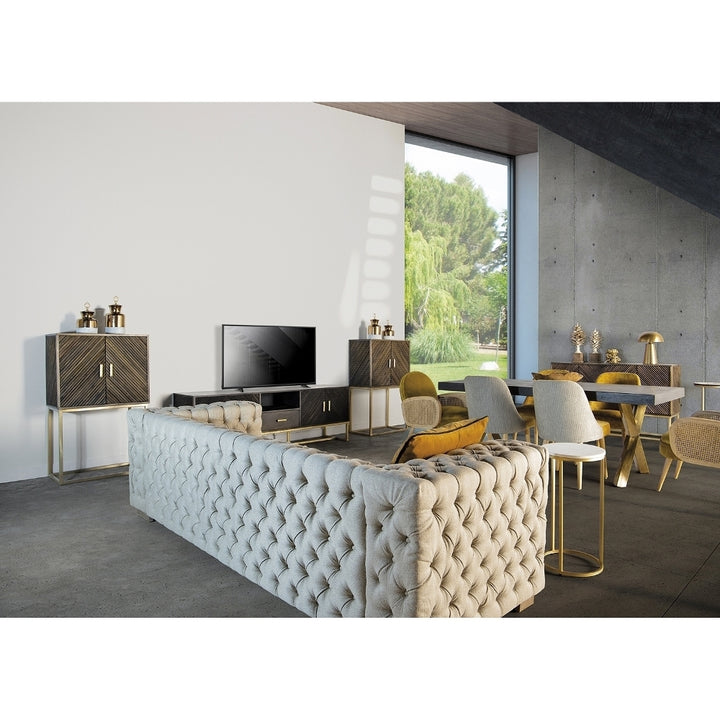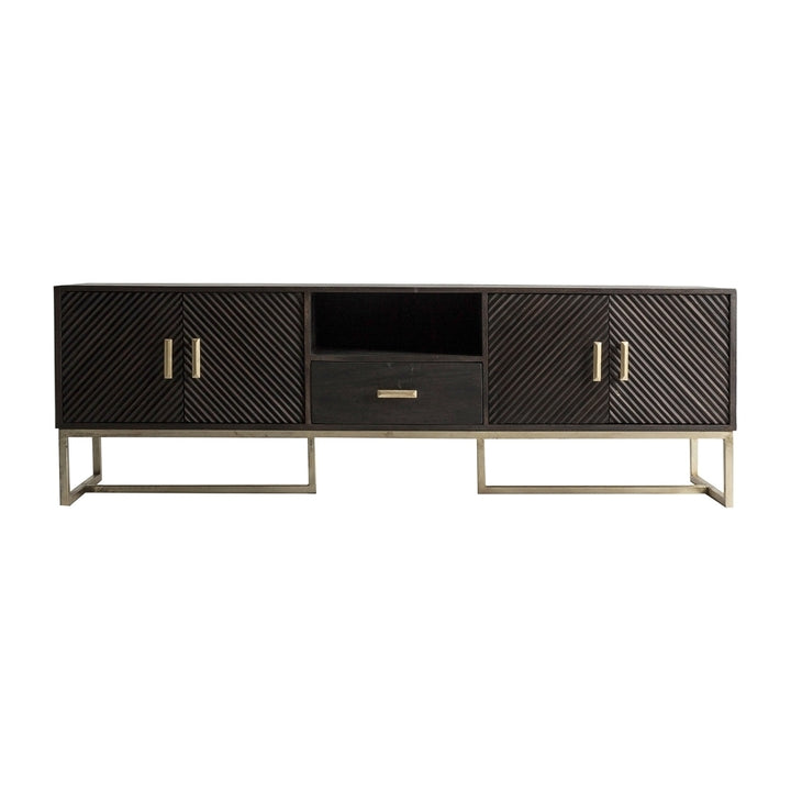 Mobile porta TV in stile Art Déco dal design audace e raffinato, perfetto per ambienti che vogliono distinguersi con materiali e finiture ricercate. Realizzato in ferro marrone e legno di mango dorato, offre un elegante contrasto tra la solidità della struttura metallica e la luminosità calda del legno. Con un peso di 58,8 kg, garantisce stabilità e robustezza, oltre a uno spazio funzionale per dispositivi multimediali e oggetti decorativi. Lavorato artigianalmente, ogni esemplare presenta dettagli e imperfezioni che lo rendono unico, donando un tocco esclusivo e scenografico a soggiorni o living dal gusto elegante e contemporaneo.
