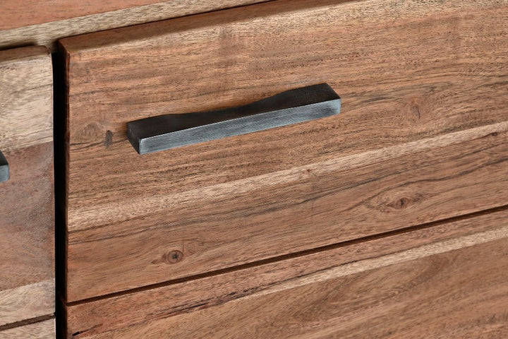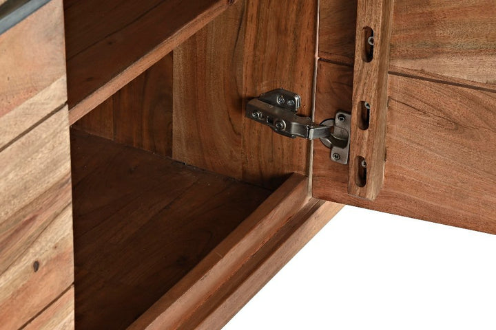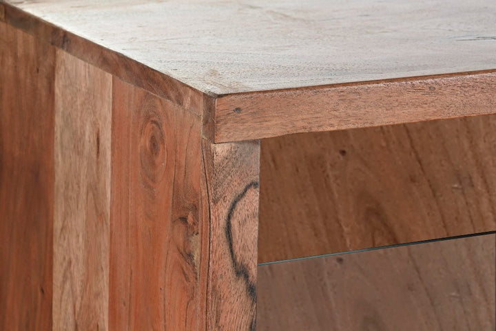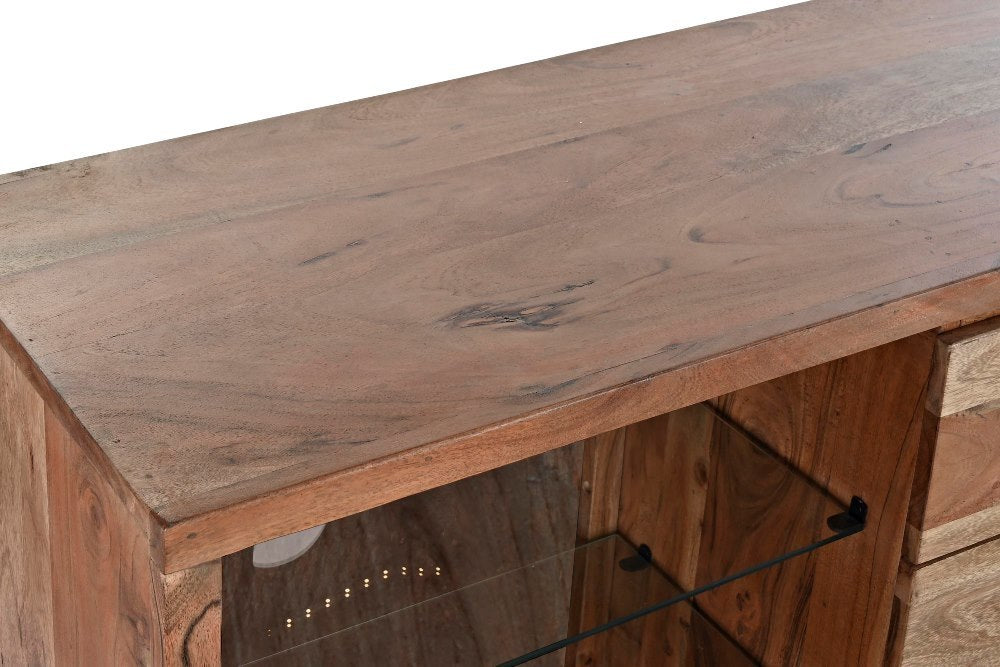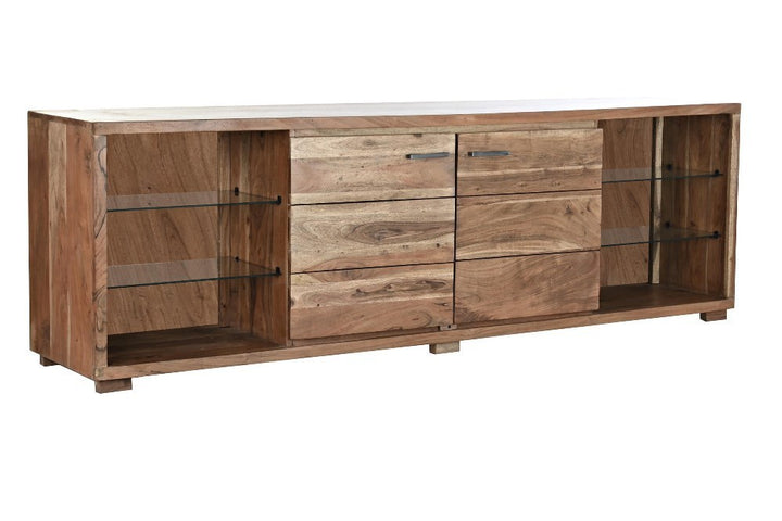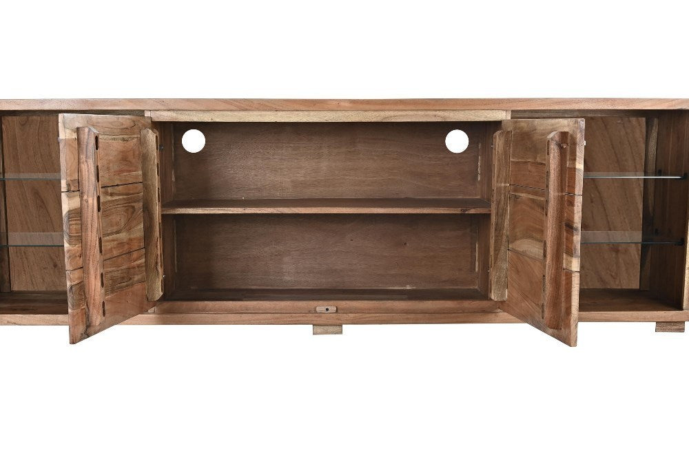 Il mobile TV living etnico è un vero e proprio capolavoro in legno di acacia, curato nei minimi dettagli per ottenere un risultato estetico senza pari. La combinazione tra il pregiato legno massello e i cristalli trasparenti conferisce al mobile un aspetto sofisticato e unico nel suo genere. Le linee pulite e decise del mobile conferiscono un tocco di modernità, mentre le finiture in legno massello di acacia creano un'atmosfera calda e naturale. Inoltre, i vani con vetri sono dotati di eleganti luci a led che illuminano delicatamente l'interno, creando un'atmosfera accogliente e intima nella tua zona living. Con una lunghezza di 200 cm, una larghezza di 40 cm e un'altezza di 63 cm, questo mobile TV è l'ideale per completare il tuo arredamento. Grazie alle sue dimensioni generose, offre ampio spazio per riporre tutti i tuoi dispositivi multimediali e accessori, mantenendo sempre un aspetto ordinato e armonioso. Se stai cercando un mobile TV dal design unico, elegante e funzionale, il mobile TV living etnico in legno di acacia e vetri con led è sicuramente la scelta perfetta per te. Aggiungi un tocco di classe alla tua zona living con questo pezzo unico di mobili design living online.